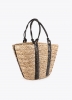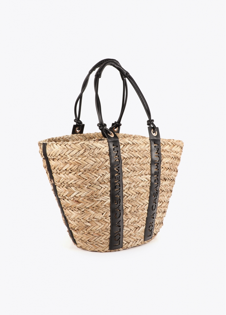 Cabas chic en osier avec poignées en cuir synthétique présentant un détail découpé pour mettre en valeur le logo de Lola Casademunt. Intérieur doublé avec imprimé animal. Parfait pour un style estival chic, idéal pour la ville ou la plage.