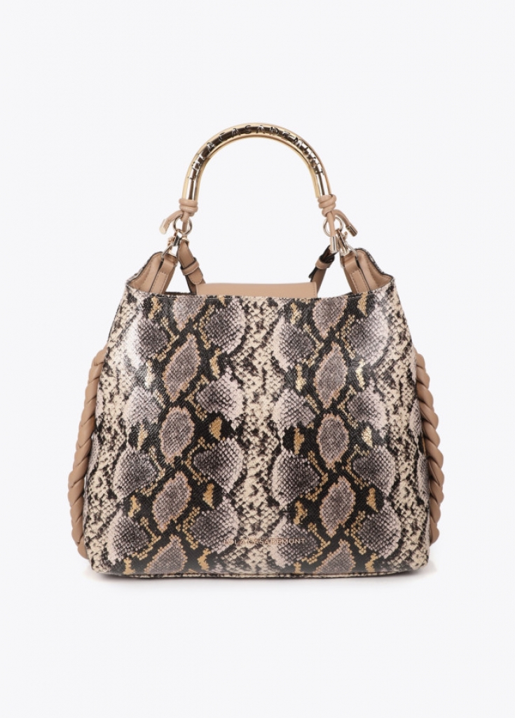 Ce cabas imprimé serpent exclusif possède une anse métallique élégante avec logo personnalisé. Intérieur spacieux avec fermeture magnétique. Parfait pour ajouter une touche sophistiquée.