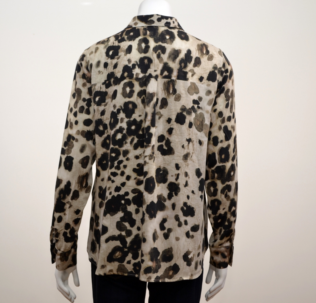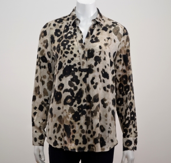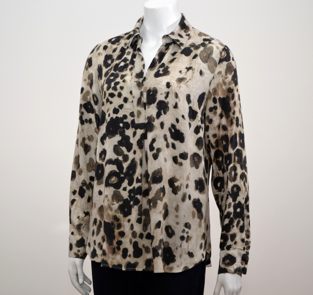 Jolie pièce affichant un imprimé animalier très tendance. Cette blouse comporte une col chemise prolongé par une grande patte buste, des manches longues avec un poignet ouvert sur des emmanchures arrondies, deux pinces buste, un pli d'aisance dos et une base arrondie. Cete blouse présente une coupe droite. Elle est confectionnée sur un support fluide et léger très agréable à porter au quotidien.