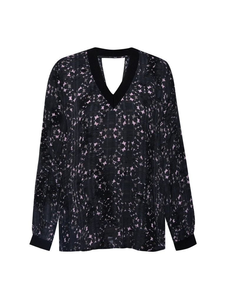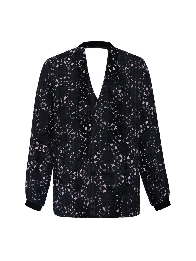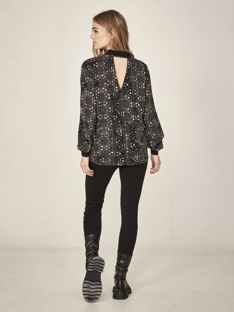 Cette blouse fine est faite d'un tissu en viscose incroyablement confortable et respirant qui offre un confort incroyable tout au long de la journée. Elle a un joli motif qui lui donne un look unique. Cette pièce a une petite encolure en V soulignée par une large bordure côtelée élastiquée qui se retrouve également aux extrémités des manches. De plus, on remarque également un joli décolleté dos en V, ce qui lui donne une allure féminine et élégante.