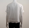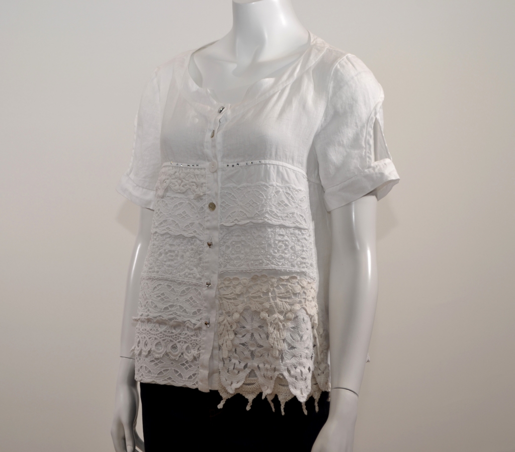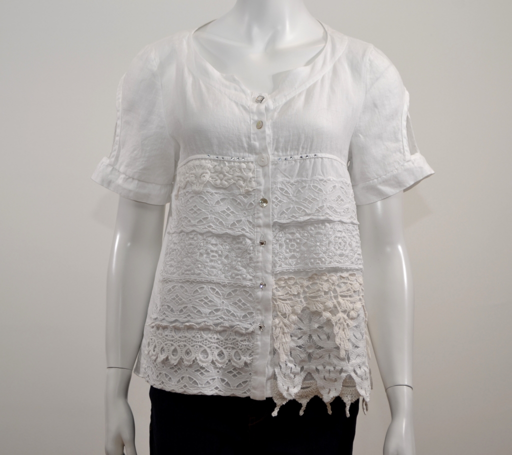 On craque volontiers pour cette belle pièce en lin très agréable à porter en période de fortes chaleurs, agrémentée de différents empiècements en dentelle et d'une ligne de brillants au niveau poitrine . Cette chemise comporte une belle encolure flatteuse en forme de coeur, des manches courtes avec découpes, un boutonnage central par des boutons bijoux emblématiques de la marque et un pli d'aisance dos. Cette pièce présente une forme classique. Elle est confectionnée sur un support en pur lin avec différentes bandes de dentelle en coton placées sur sa partie avant.
