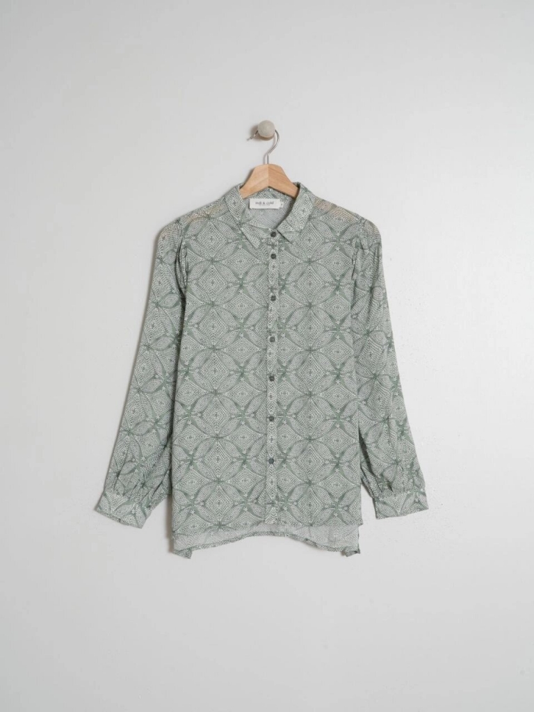 Cette chemise à l'imprimé ethnique présente un col chemise et des épaules ajustées. Sa coupe décontractée lui donne une allure décontractée. Un vêtement de haute qualité. Elle est légèrement transparente.