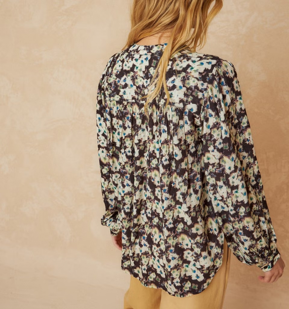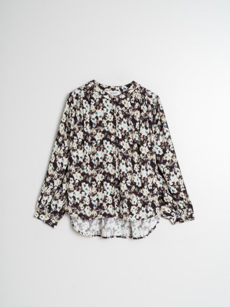 Une chemise intemporelle avec col rond, épaules cintrées et manches avec volume. Elle a le buste froncé pour donner de l'ampleur au vêtement. Le tissu en viscose 100 % la rend légère et avec beaucoup de mouvement.