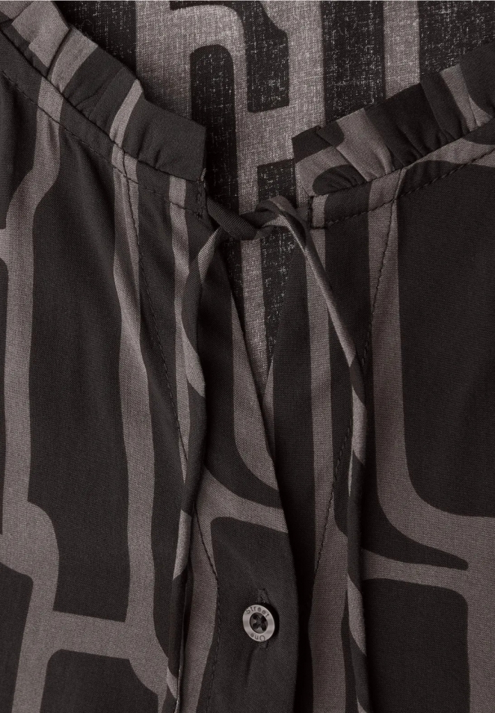 Cette chemise combine un motif graphique vivant avec des détails décoratifs en tape sur les manches. Des volants, un split neck avec des rubans et une patte de boutonnage lui confèrent une note romantique et ludique. Le doux mélange de viscose assure un confort fluide. Parfait pour des tenues stylées avec du caractère.