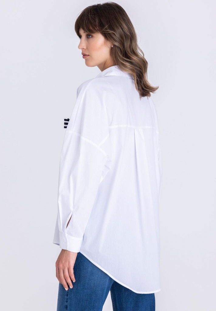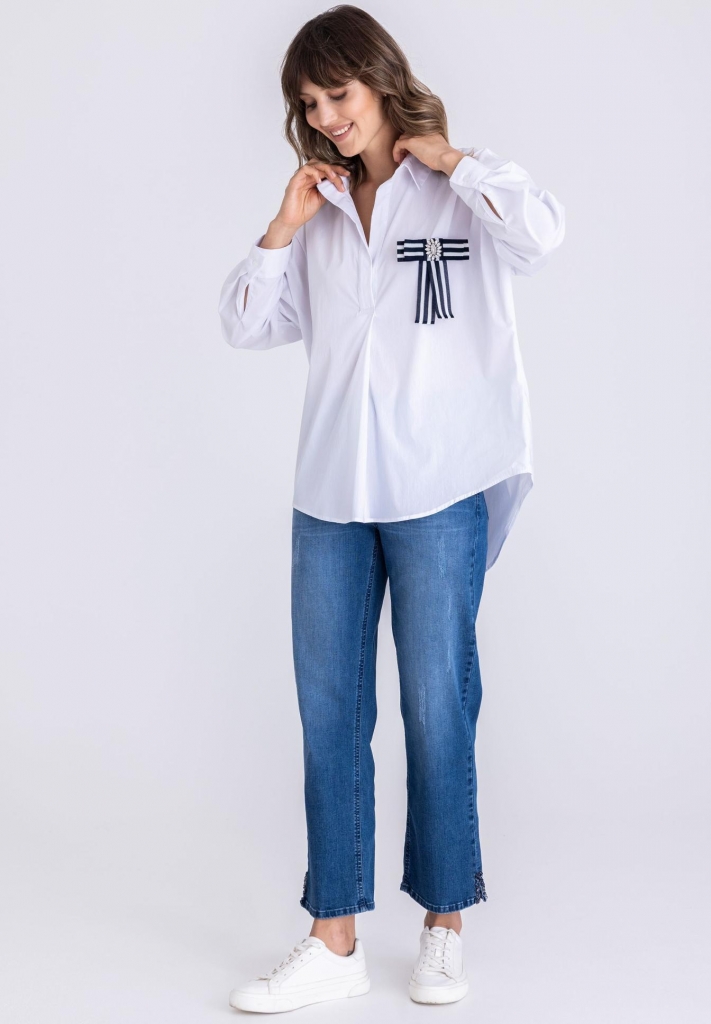 Chemise classique à la coupe ample, ourlet arrondi et nœud décoratif sur la poitrine.