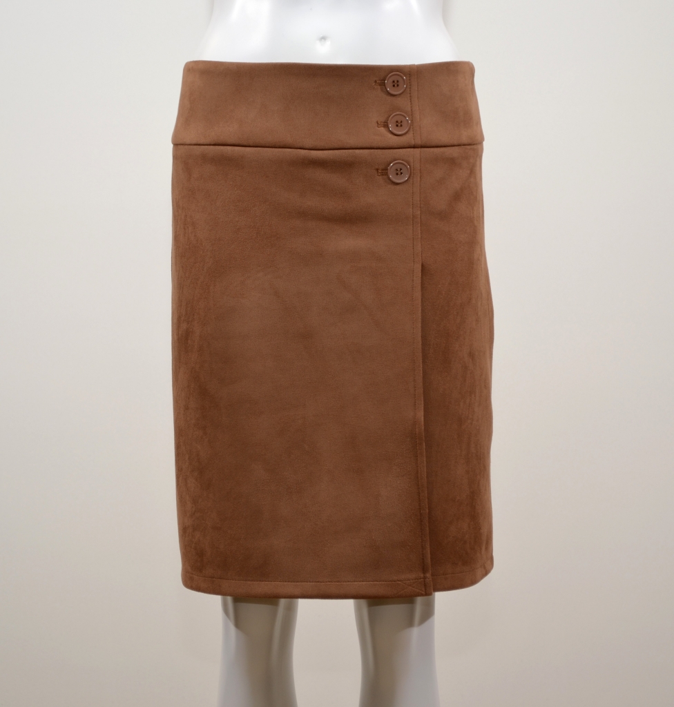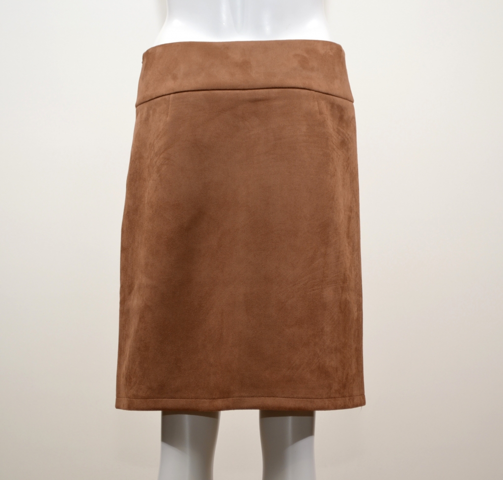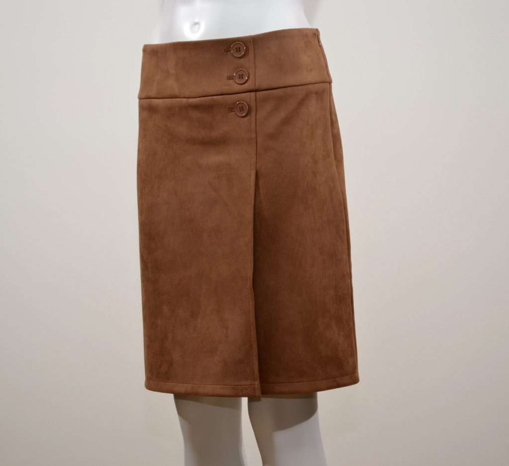 On craque volontiers pour cette jolie pièce façon portefeuille originale à plus d'un titre. Cette jupe comporte une grande ceinture agrémentée de boutonnières en trompe l'œil, une à glissière de côté et un pli d'aisance sur sa partie avant. Cette pièce présente une coupe droite sur une longueur genou. Elle est confectionnée sur un support suédé très agréable à porter. Nous vous conseillons de lui associer la veste perfecto assortie 4414/1178.