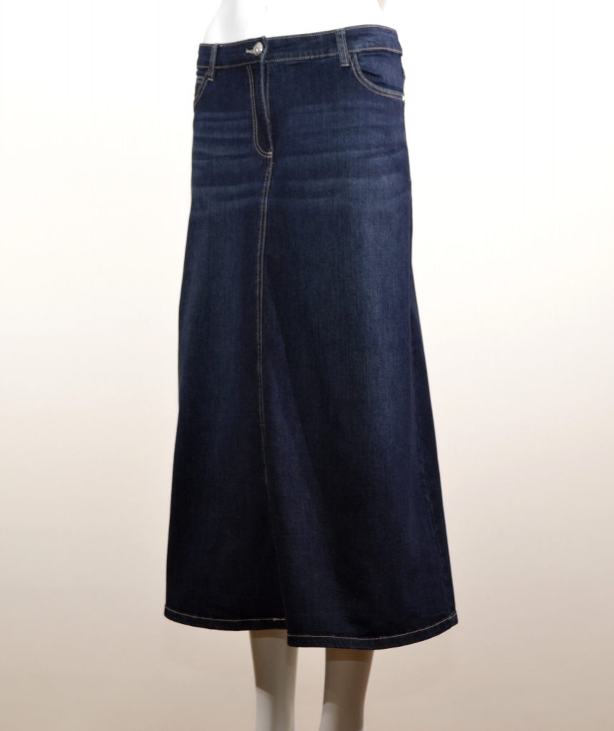 Cette longue jupe en jean arbore une coupe évasée élégante. Elle comporte une large ceinture sous passants, une fermeture centrale à glissière complétée par un bouton métal, deux poches western dont une complétée par une poche ticket et deux poches plaquées dos brodées. Proposée sur une longueur midi, elle est une alternative idéale au jean. Polyvalente, elle se porte aussi bien avec des talons pour un look chic qu'avec des ballerines pour un style décontracté. Un indispensable de votre garde-robe qui allie confort, élégance et praticité au quotidien. Nous vous conseillons de lui associer la veste assortie 4721/1831.