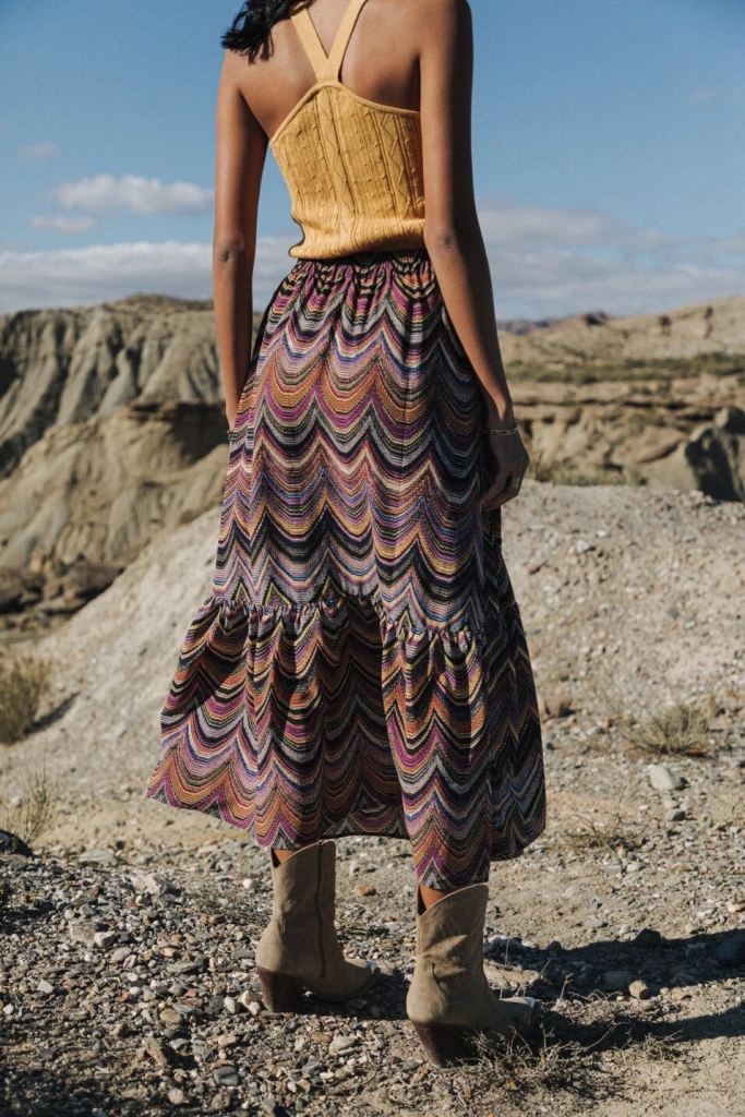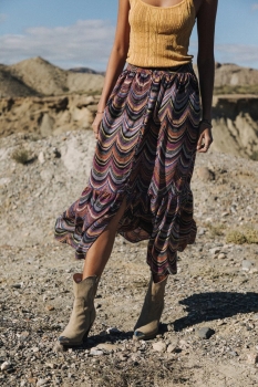 SI, SEÑORITA : Jellis c'est une jolie jupe à l'allure dansante, une véritable invitation à la plage et au « farniente ». Cette jupe longue est entièrement boutonnée de quoi laisser entrevoir juste ce qu'il faut de ses jambes. Elle est également dotée d'un grand volant qui lui donne encore plus d'ampleur.
