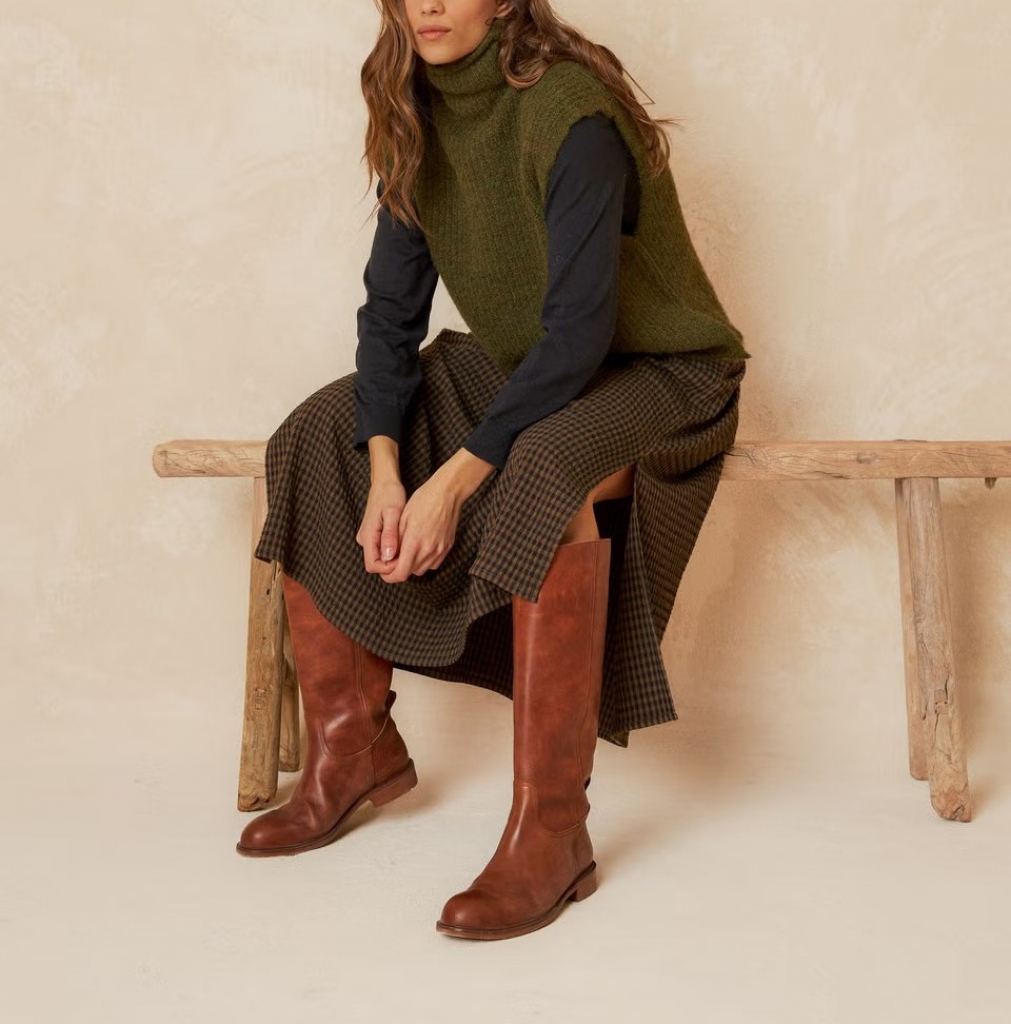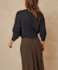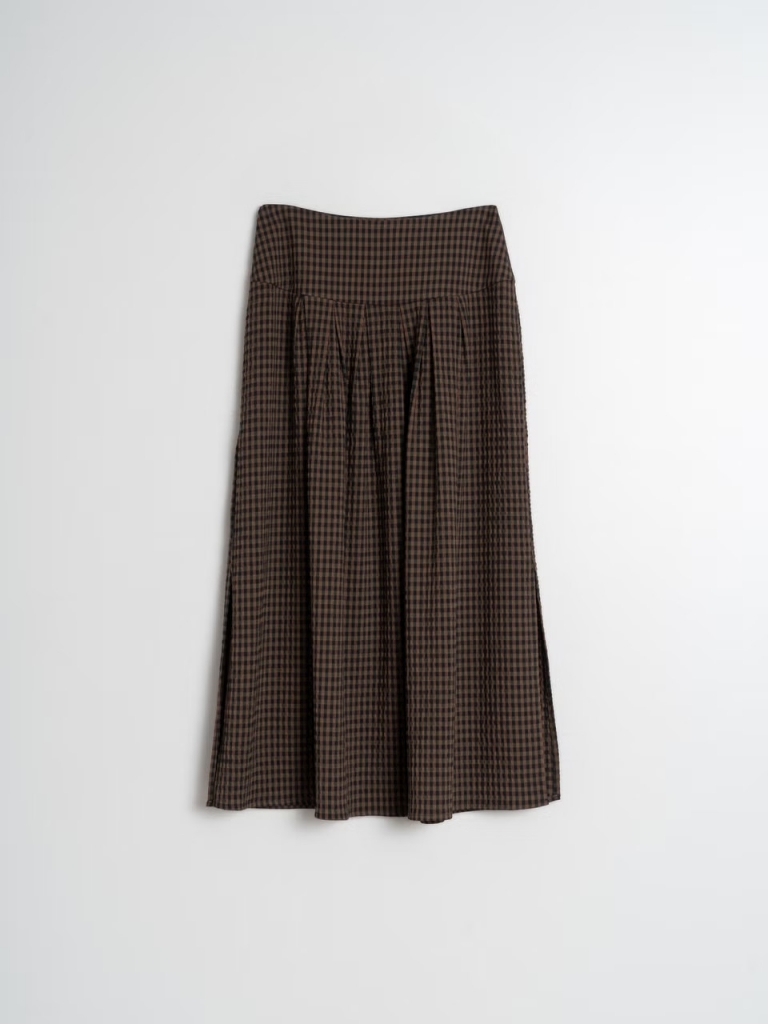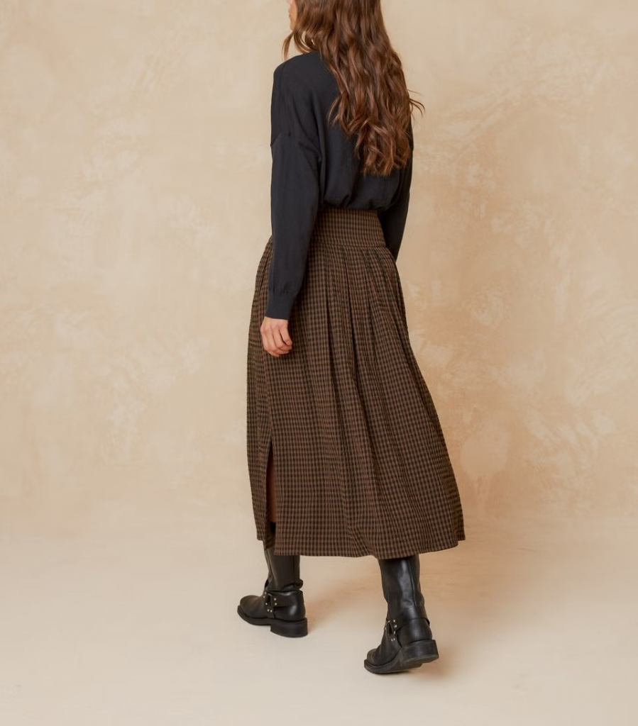 • Taille midi avec fermeture éclair latérale cachée • Détails de fronces pour donner de l'ampleur à la jupe et fentes latérales au bas de la jupe • Tissu mini écossais en viscose faussement uni.