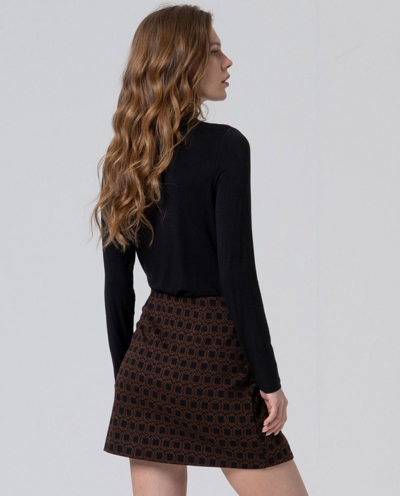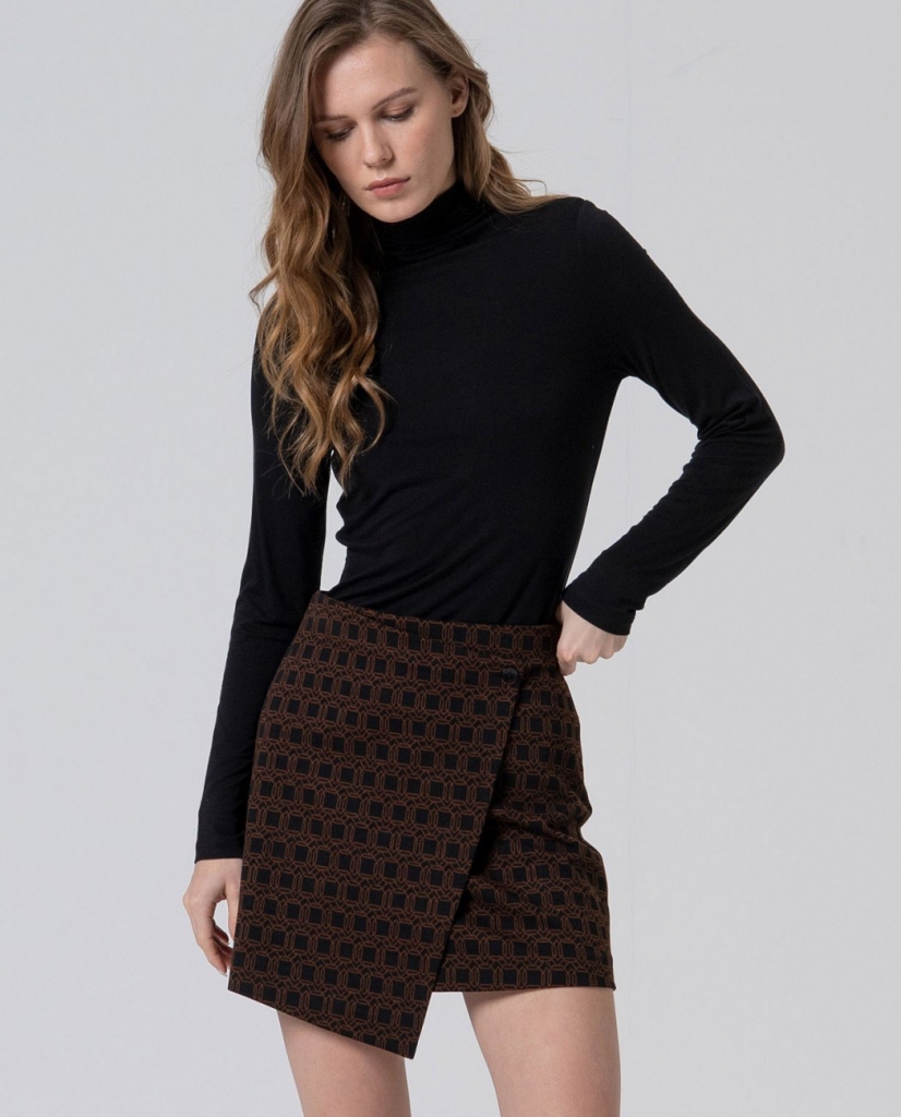 Jupe courte à motif croisé sur le devant, sans fermeture, réalisée dans un tissu élastique et doux au toucher. Son imprimé géométrique original apporte de la personnalité et un air contemporain à toute tenue.