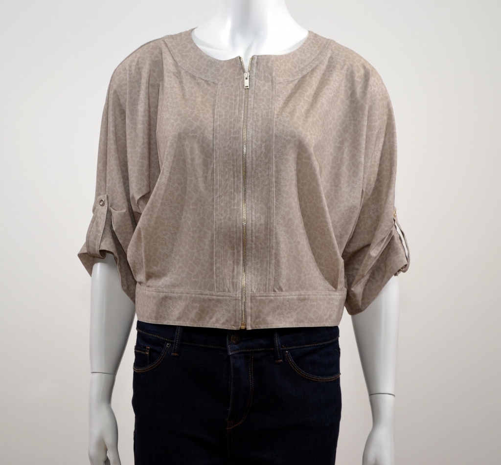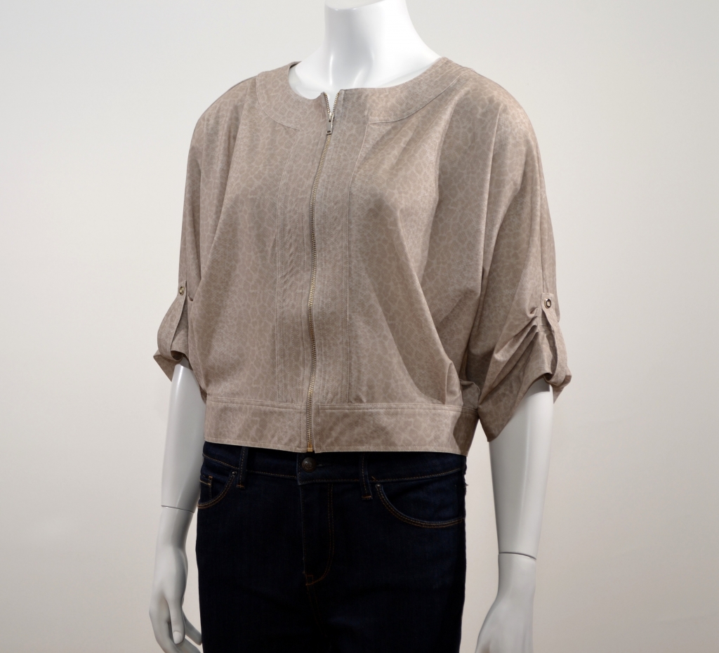 Un superbe produit looké réalisé sur un support SENSITIVE : tissu respirant, facile d'entretien, infroissable, qui vous apportera un confort maximal. Ce blouson court comporte une encolure ronde soulignée par différentes surpiqûres, des manches trois quart fashion terminées par une patte pressionnée sur des emmanchures chauve-souris, une femrture centrale à glissière, un pli d'aisance dos et large bande raportée à la base agrémentée de quelques fronces. Ce blouson présente une coupe loose. Il est confectionné sur un support proposant des motifs animaliers et nous vous conseillons de lui associer le pantalon assorti CTP0208 pour une parfaite silhouette qui répondra à vos attentes pour toutes les circonstances de la journée.