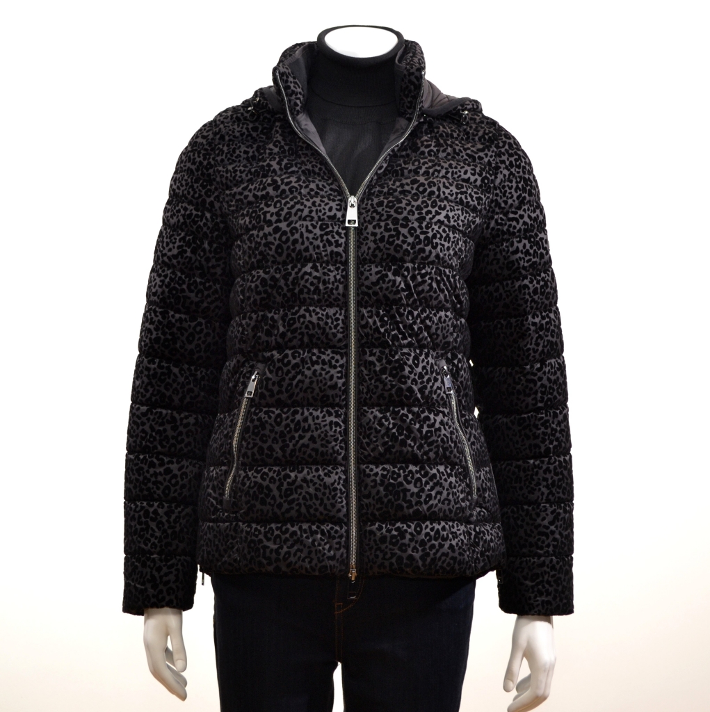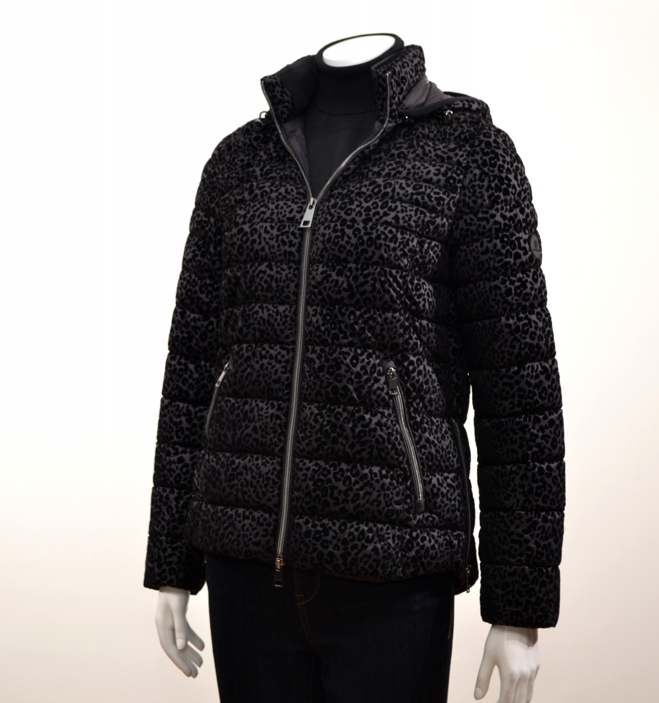 Belle pièce reversible légère et confortable proposée sur un imprimé animalier en velours. Cette doudoune comporte une encolure montante complétée par une capuche amovible avec bordure coulissable par cordon de serrage à moduler selon votre souhait et un double col intérieur en maille noire à côtes plates, des manches longues, une fermeture centrale à glissière à double curseur, deux poches fendues zippées avec piping, un zip de chaque côté avec soufllet d'aisance et une base arrondie avec le panneau arrière légèrement descendu. Cette pièce présente une forme régular. Elle est confectionnée sur un support matelassé qui vous apportera confort et bien-être tout au long de cette nouvelle saison. Un discret patch en logotypé en gomme se trouve placé sur la manche gauche.