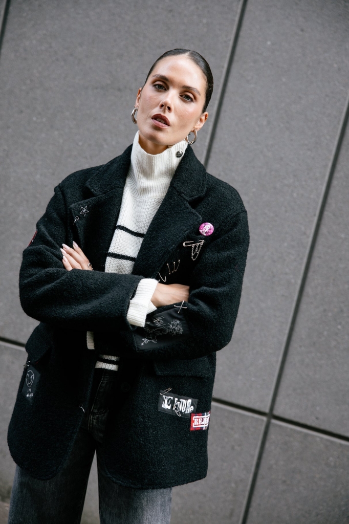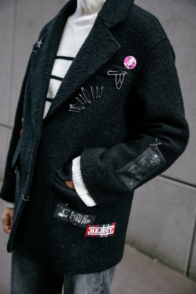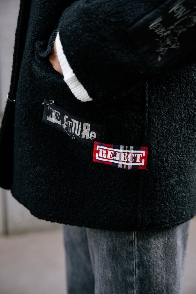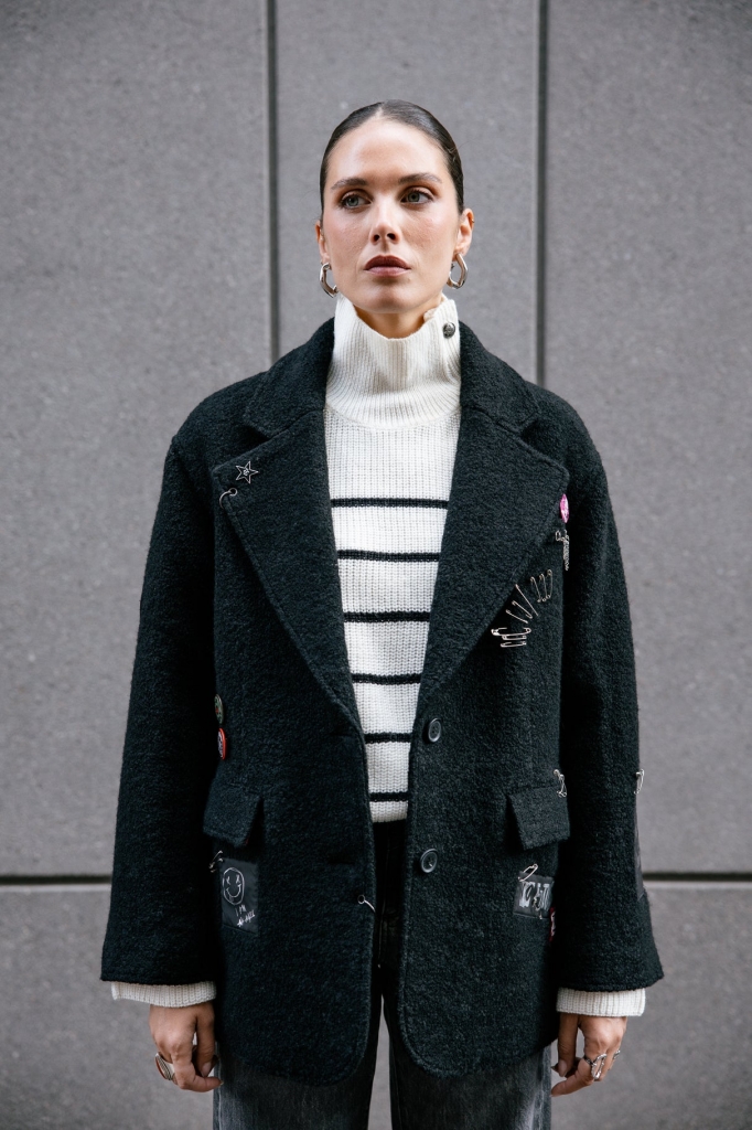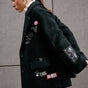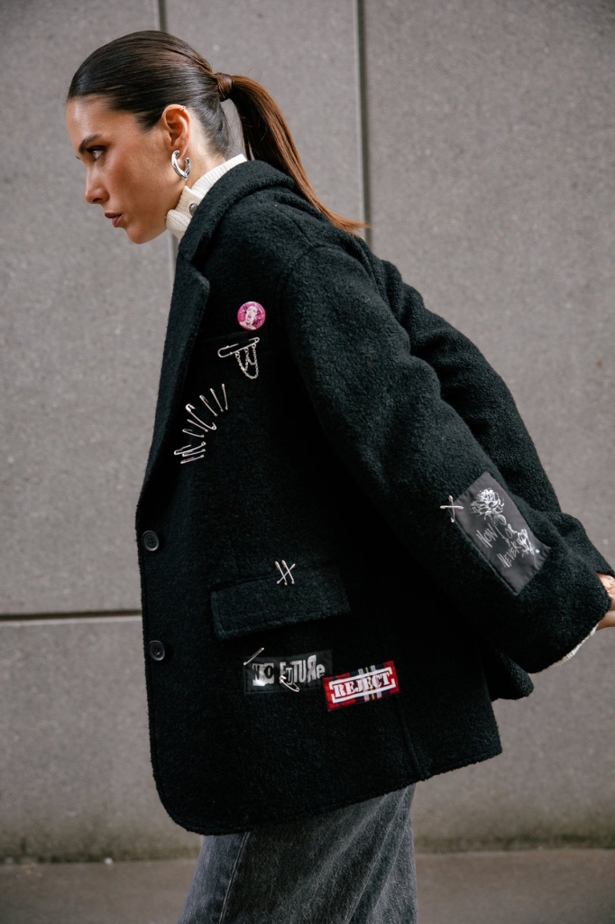 • Patch, badges fantaisies, épingles à nourrices et chaînettes métalliques de part et d'autre de la veste pour un effet rock