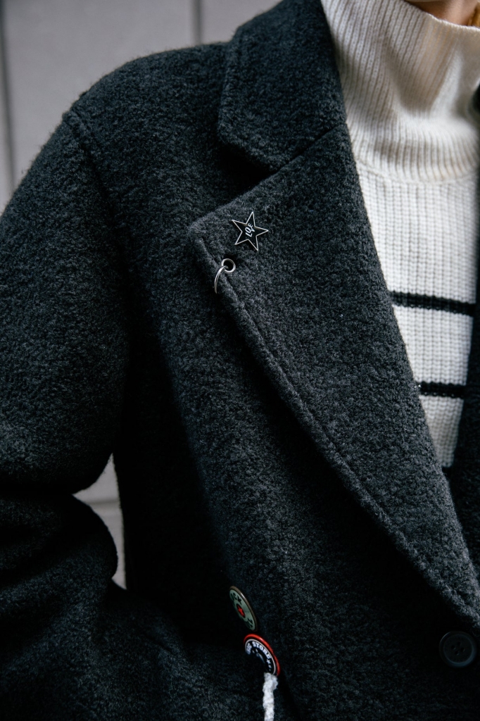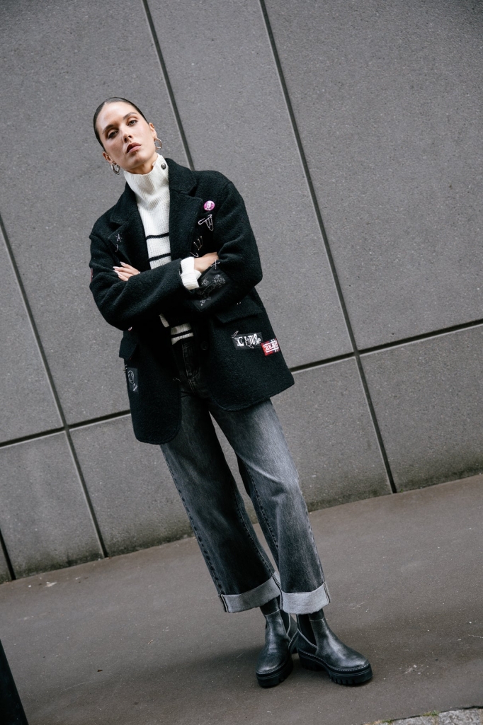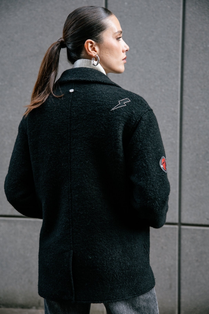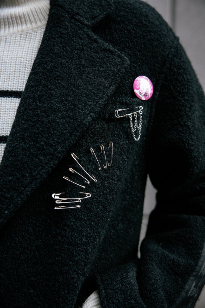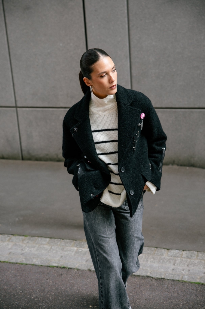 • Patch, badges fantaisies, épingles à nourrices et chaînettes métalliques de part et d'autre de la veste pour un effet rock