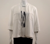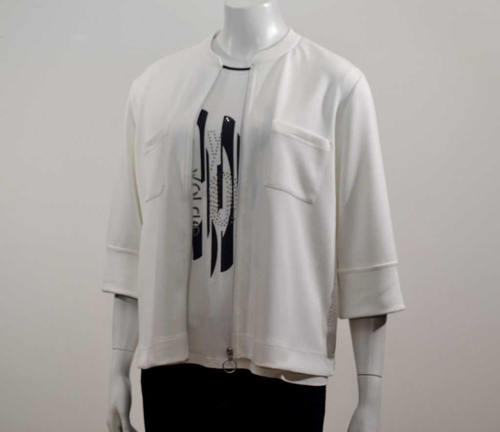 Pièce très facile à vivre à avoir toujours à portée de main. Cette veste comporte une encolure ronde, des manches trois quart fashion sur des emmanchures arrondies, une fermeture centrale à glissière, deux poches plaquées poitrine et une piping noir de côté. Cette pièce présente une forme droite. Elle est confectionnée sur un support fluide et léger très agréable à porter et arbore sur un côté un lettrage "WONDERFUL TIME" marqué à froid.