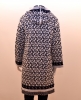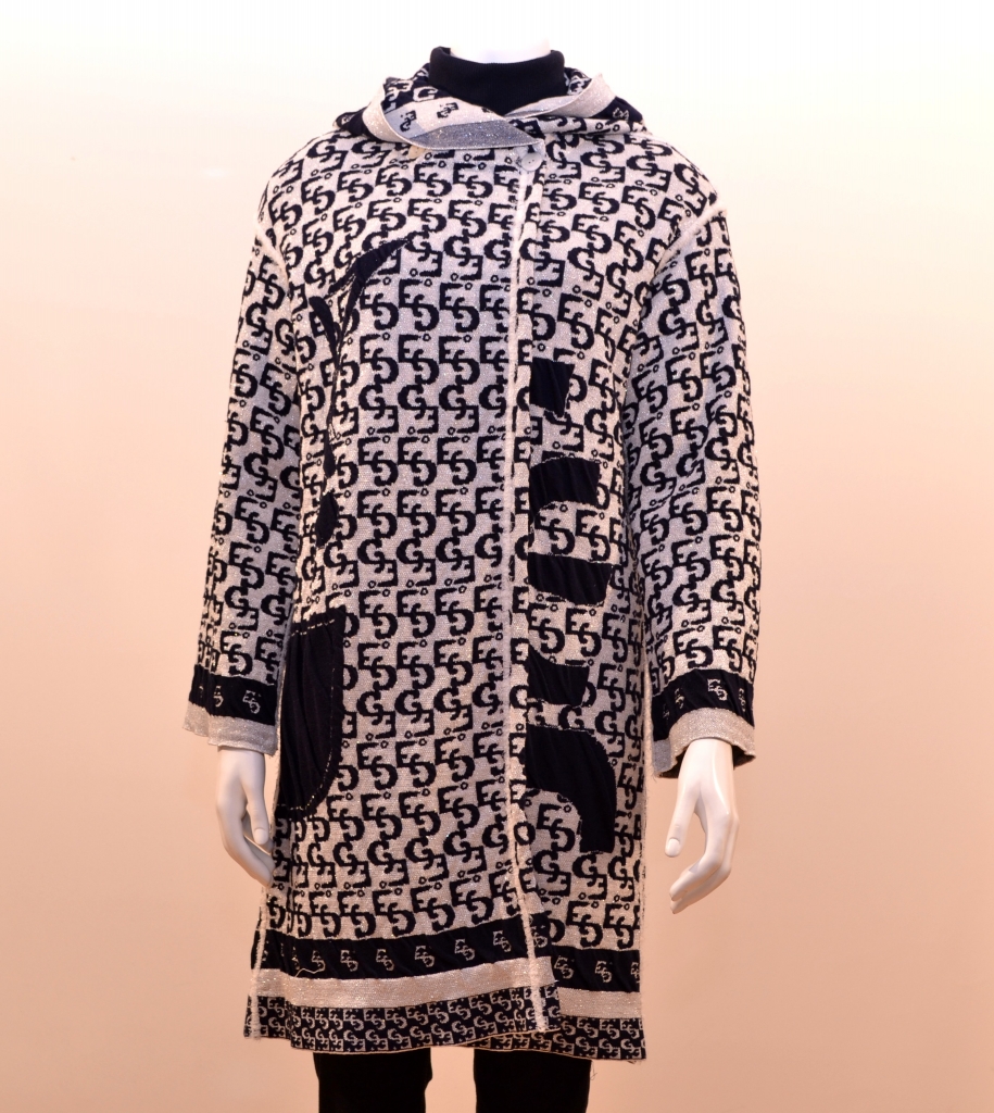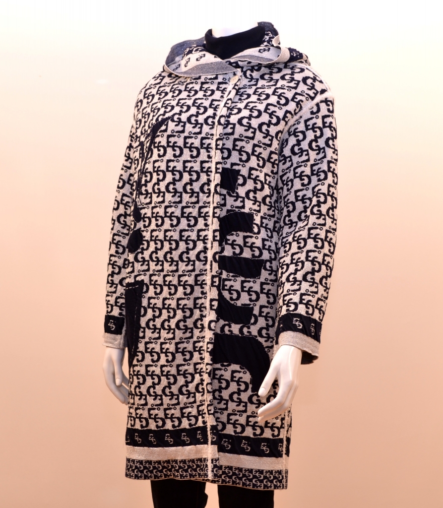 Certainement une des plus belles pièces de notre collection pensée et dessinnée par DANIELLA DALLAVALLE. Cette veste longue comporte une encolure ronde prolongée par une capuche attenante contrastée non amovible, des manches longues légèrement évasées sur des emmanchures arrondies, une fermeture par deux boutons bijoux placés sous l'encolure et une poche trompe l'oeil sur la partie basse. Cette veste présente une coupe droite sur un longueur genou. Elle est confectionnée sur une très maille tricotée avec un fil lurex laissant apparaître les initiales de la marque en relief et en contraste.