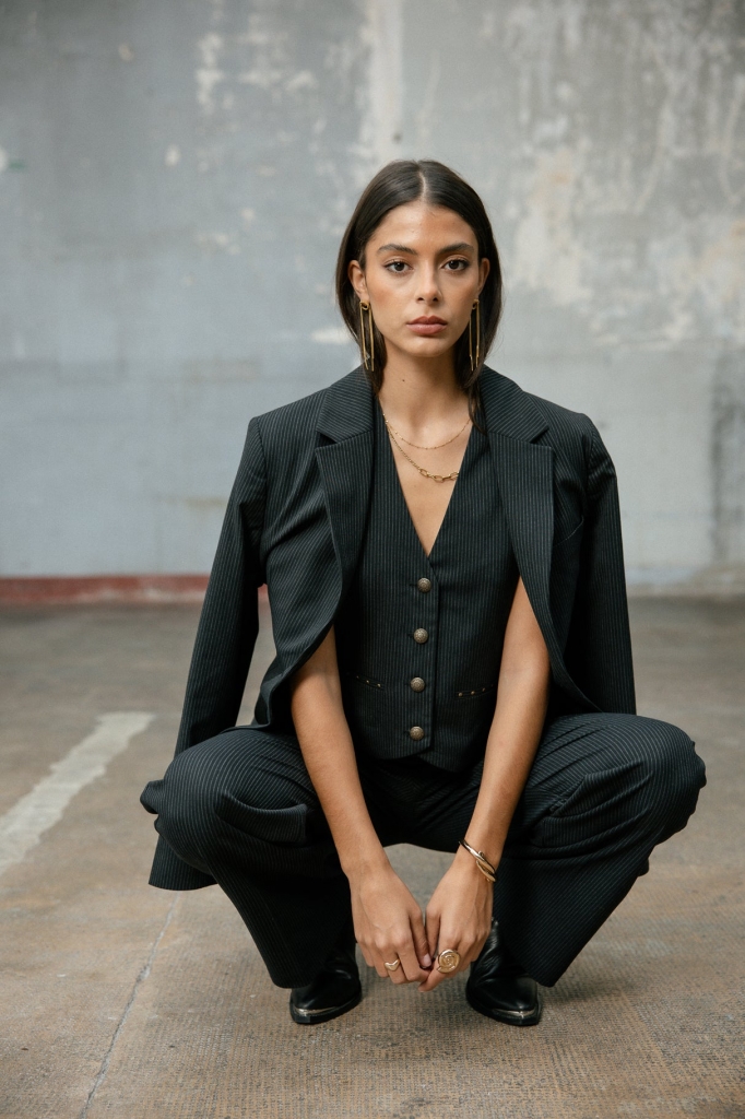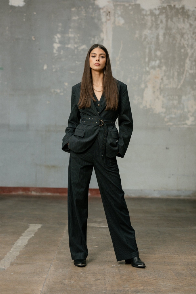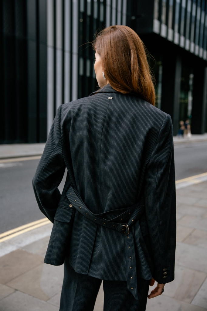 Blazer large proposé sur une rayure très fine.