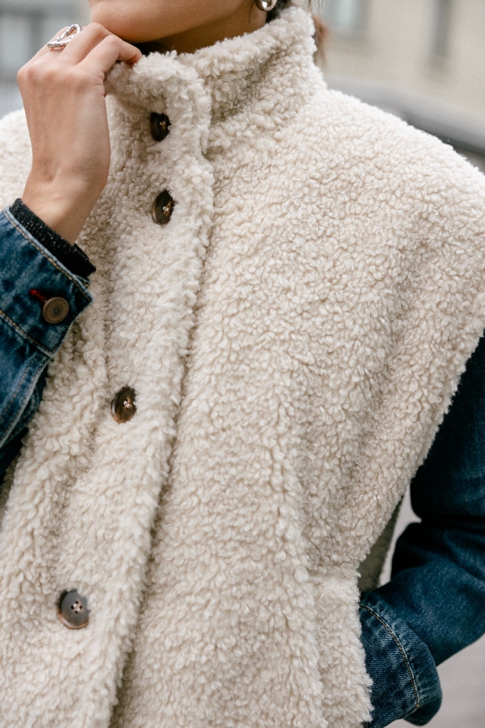 Veste sans manches à col montant proposée dans une matière style "sherpa" unie douce et chaleureuse.