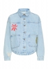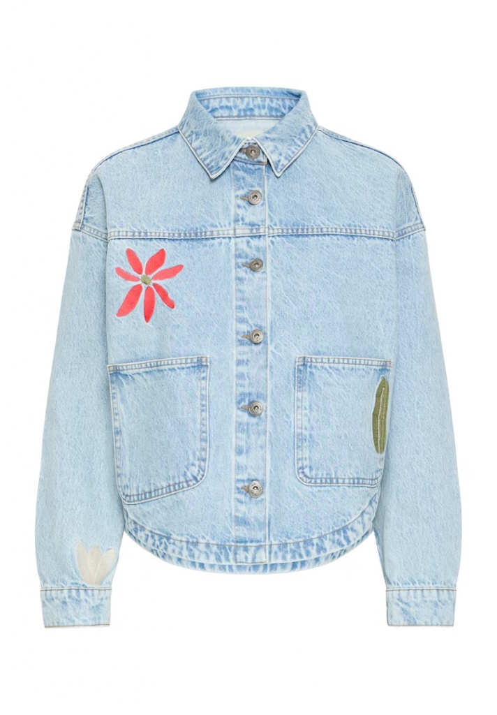 Veste en denim coupe droite et ample, finitions arrondies, grandes poches plaquées et fermeture boutonnée. Fleurs brodées apportent du style.