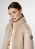 Manteau élégant combinant plumes et fourrure synthétique. Design ecru avec fermeture éclair frontale. Manches longues rembourrées et détail de logo métallique sur la manche. Doublure intérieure douce pour plus de confort.