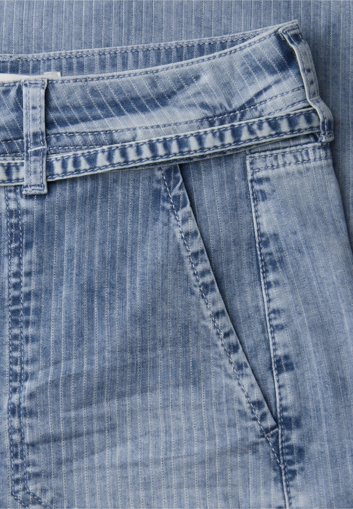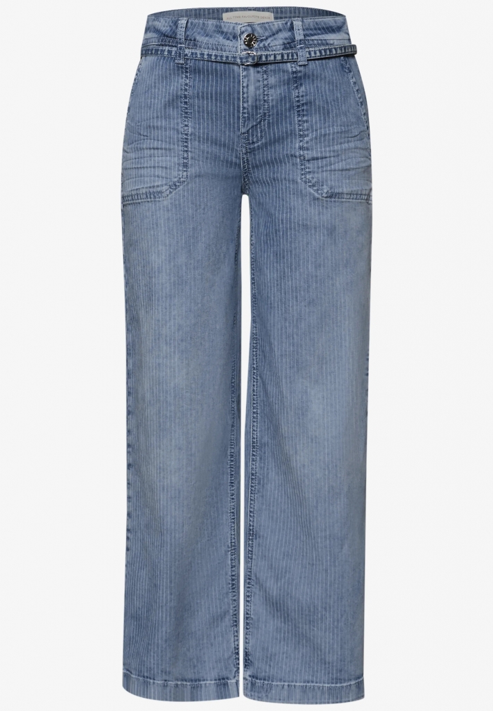 Jambes larges et taille moyenne pour ce jean à fines rayures.