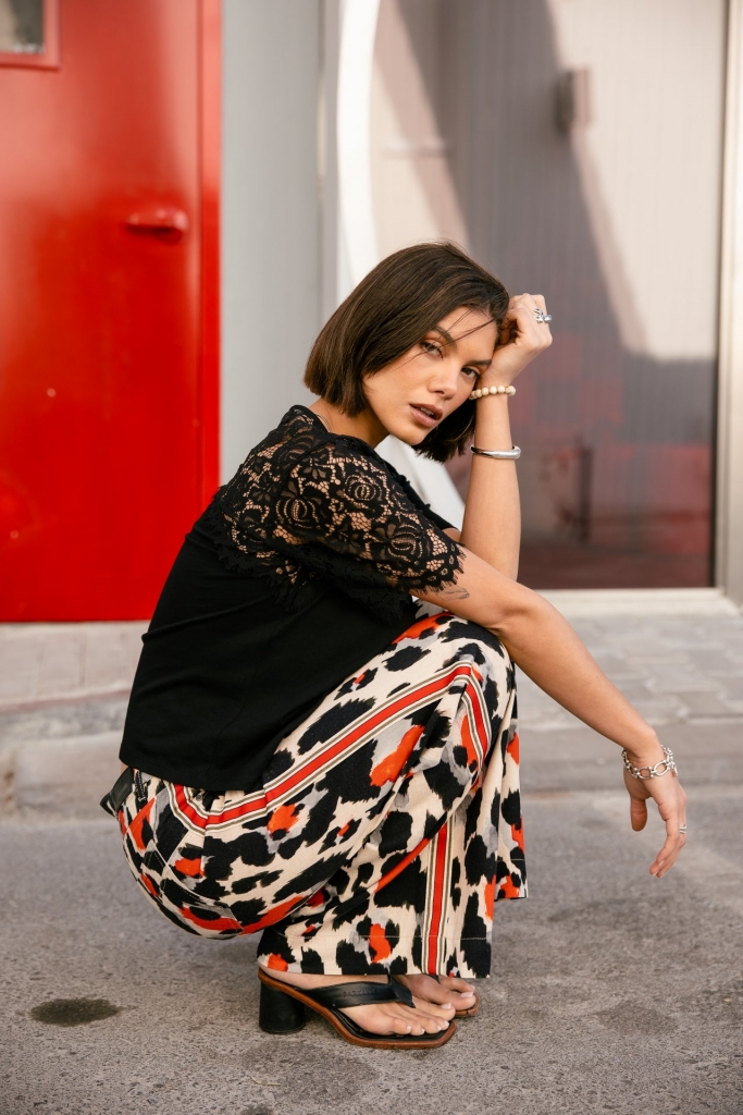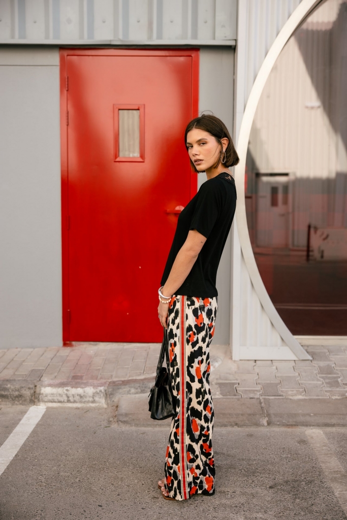 Pantalon large très visuel.
