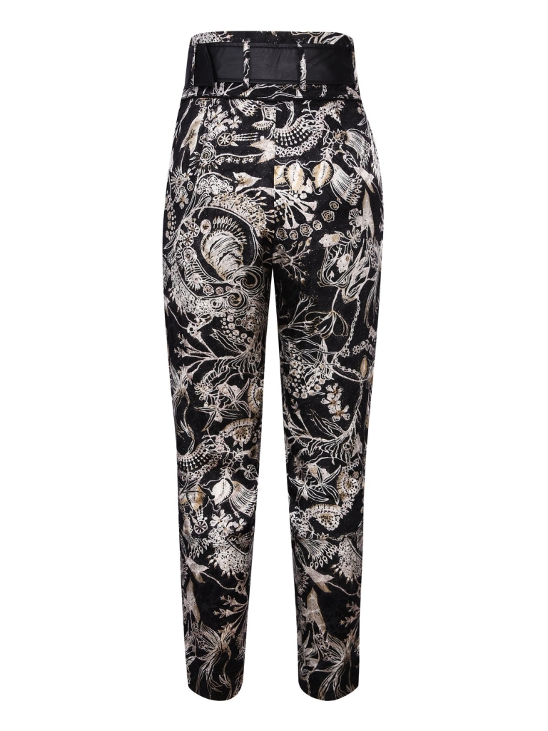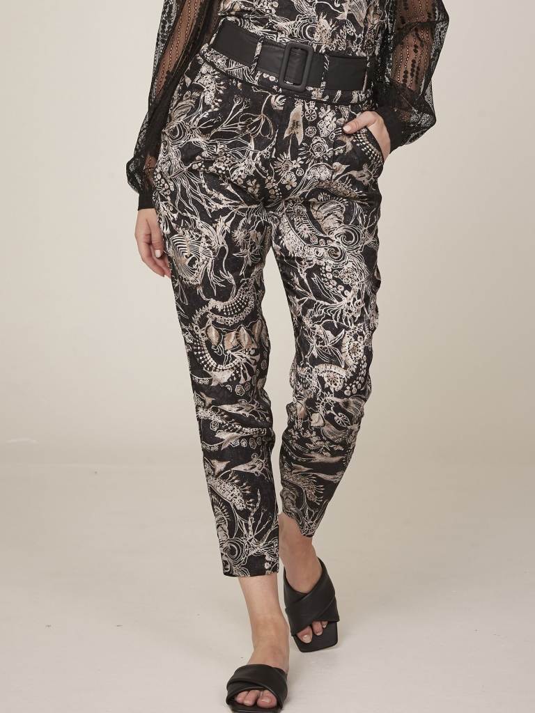 Ce magnifique pantalon est fait à partir un tissu viscose lisse et doux. Le pantalon présente un beau motif floral dans les tons blancs, dorés et roses. Le pantalon s'adapte librement dans les cuisses et serré dans les chevilles. La taille est haute et possède une large ceinture en similicuir qui donne au pantalon une touche avant-gardiste.