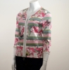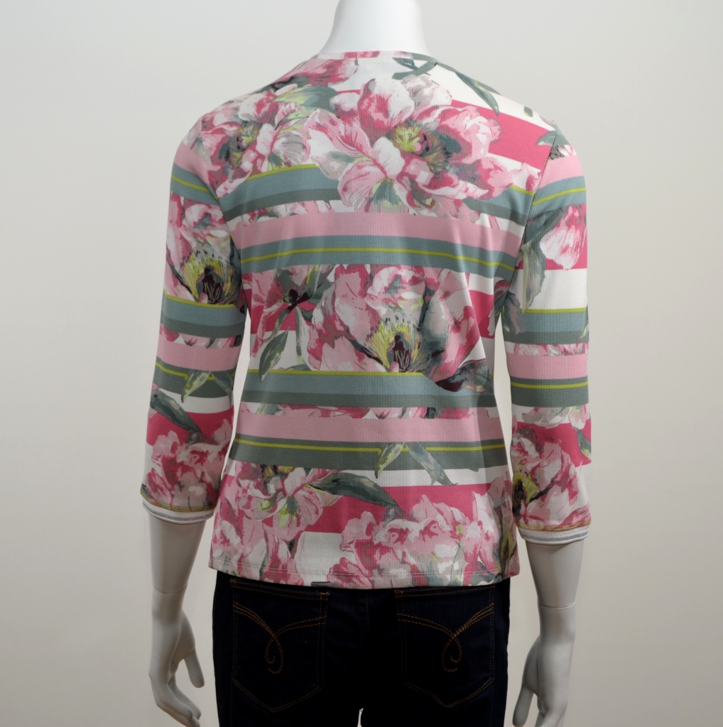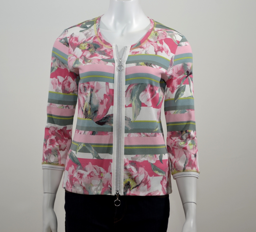 Belle palette de couleurs pour ce modèle à porter seul ou en superposition. Ce cardigan comporte une encolure ronde, des manches trois quart fashion, une fermeture centrale à glissière à double curseur avec une gance blanche et une base droite. Il présente une forme régular. Il est confectionné sur un support coton/élasthanne à très fines côtes proposant des impressions florales et des rayures en all over.