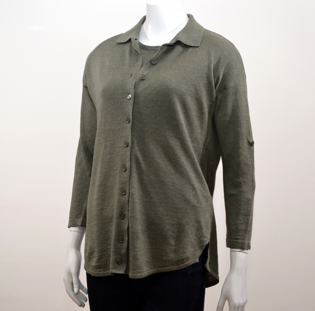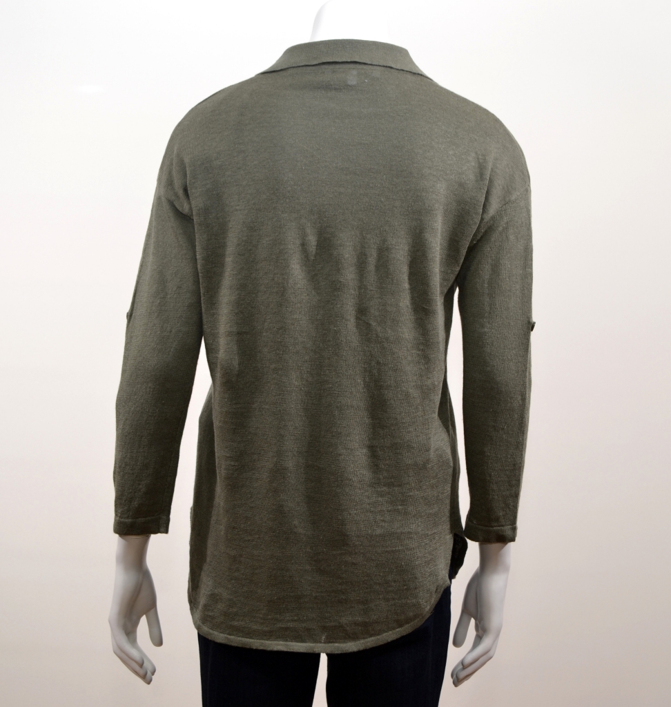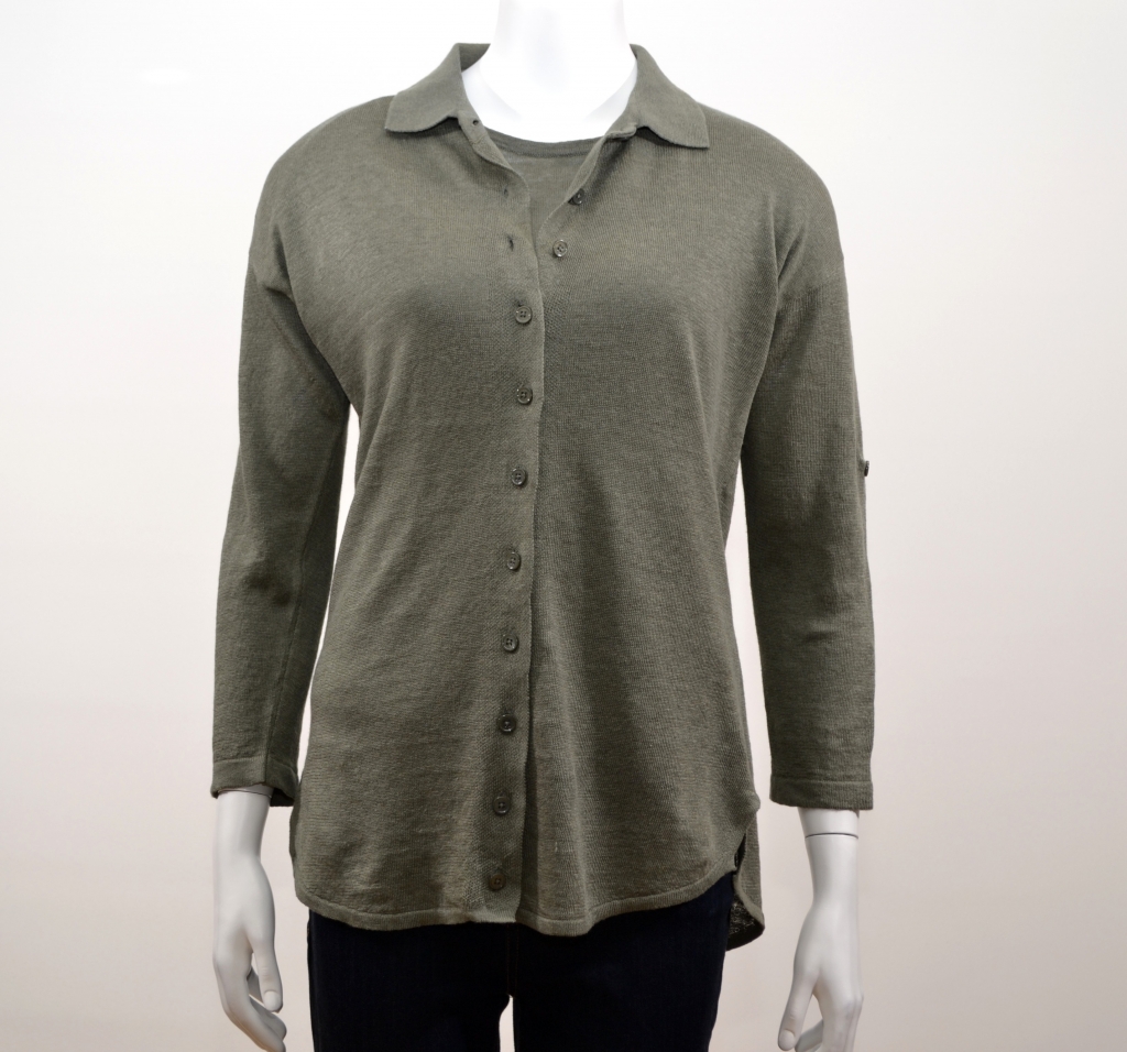 La pièce en lin très agréable à porter et à avoir toujours à porter de main tout au long de la période estivale. Ce gilet comporte une encolure polo, des manches longues sur des emmanchures droites, un boutonnage central et une base arrondie avec fentes de côté. Ce gilet présente un volume droit. Il est confectionné sur un support en pur lin et dispose d'une patte intérieure permettant de retrousser les manches. Nous vous conseillons de lui associer le tee-shirt assorti F2615EE pour un super twin-set.