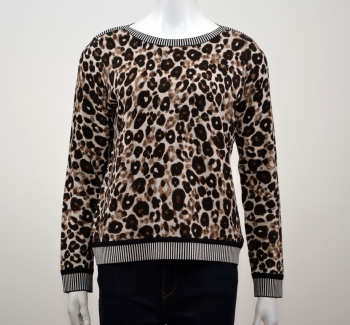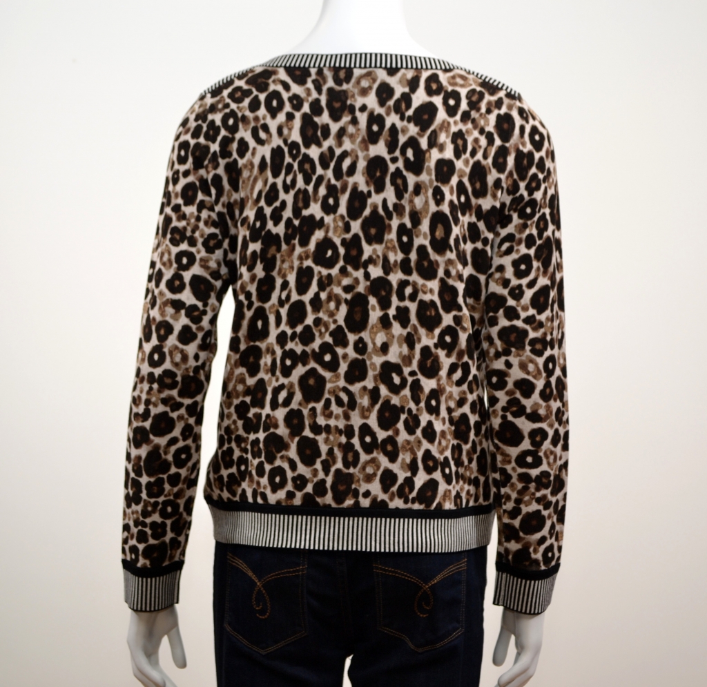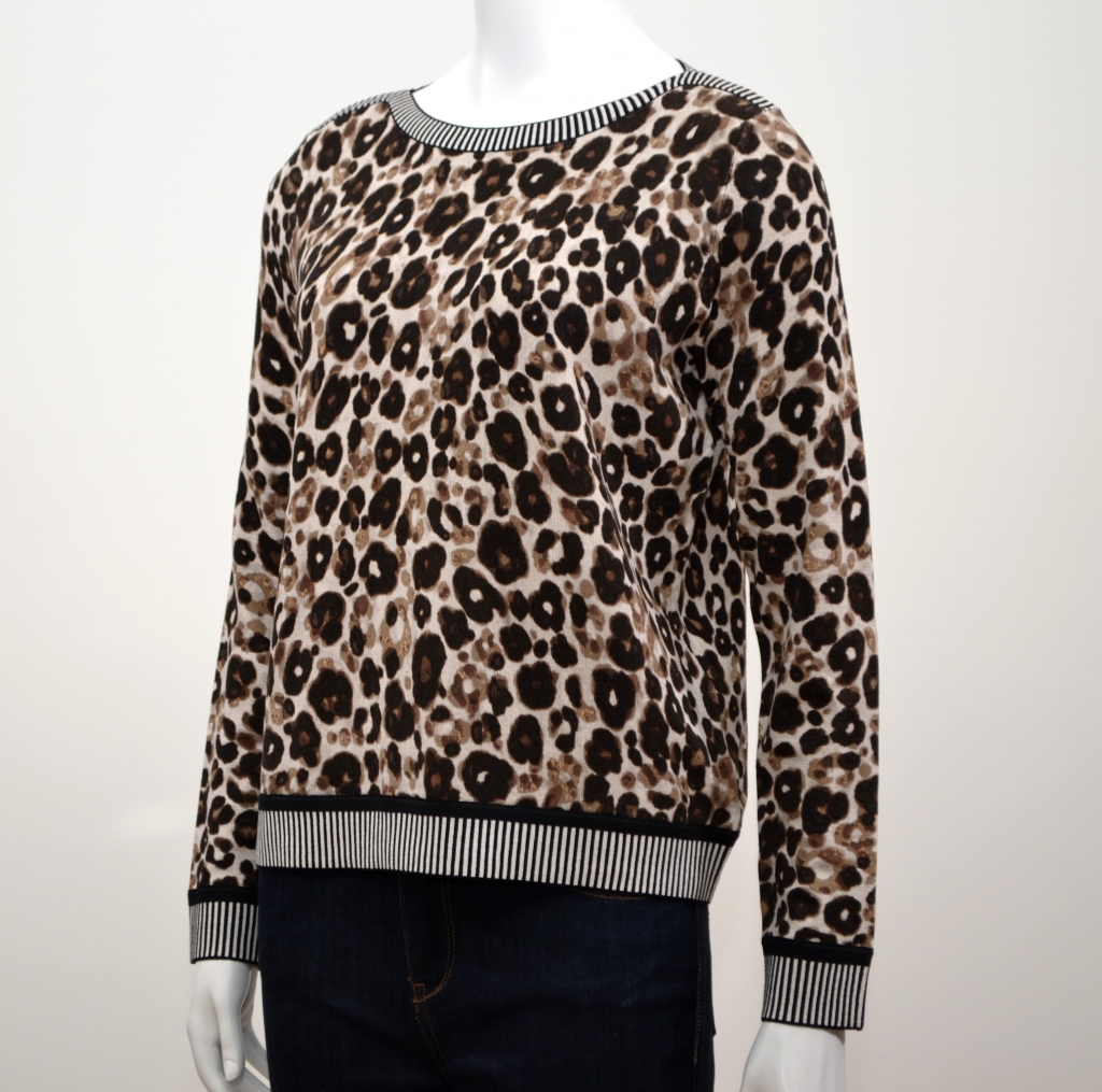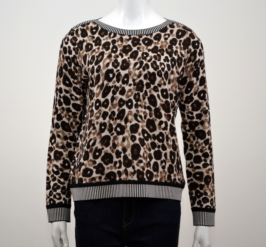 Ce pull en maille arbore un imprimé animal audacieux contrastant avec un ourlet, une encolure et des poignets rayés. Ce pull comporte une belle encolure bâteau, des manches longues et une base droite.Il présente une coupe décontractée flatteuse. Ce pull est confectionnée dans un tissu doux en viscose et polyamide. Ce modèle apportera sans aucun doute une touche d'originalité à votre garde-robe.