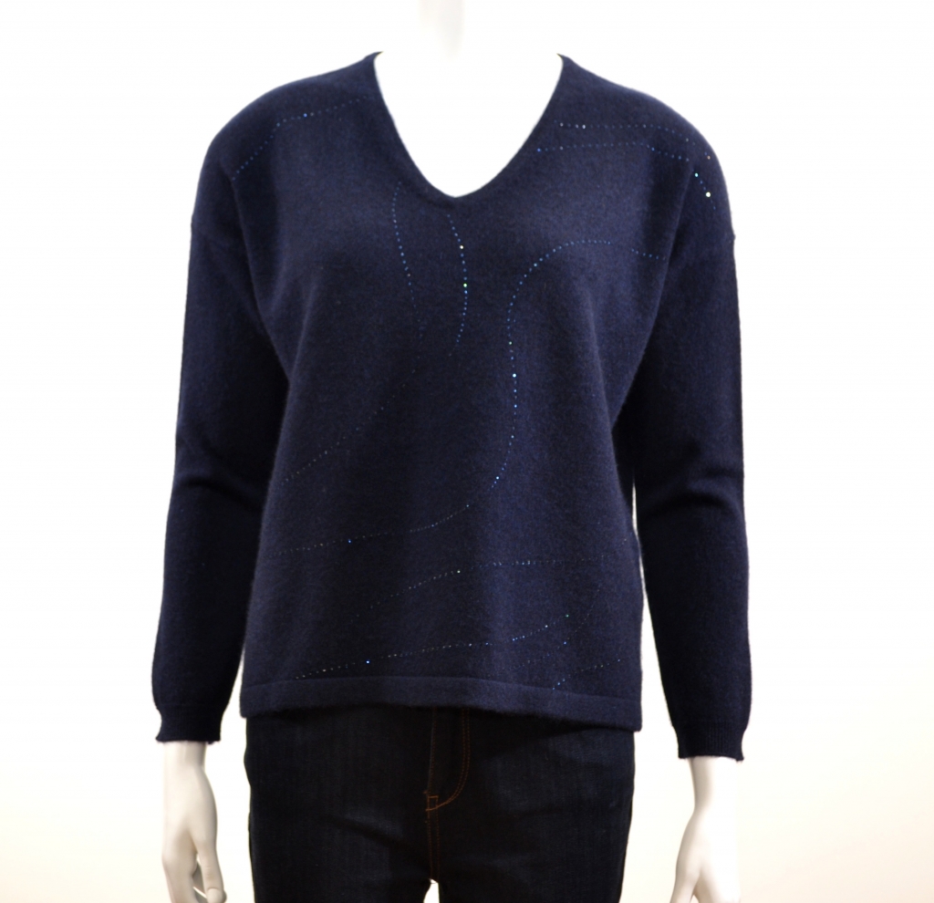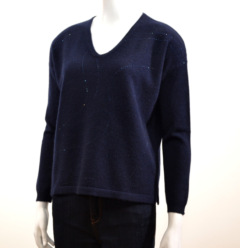 Coupe loose pour ce joli modèle uni parsemé d'une ribambelle de brillants. Ce pull comporte une belle encolure flatteuse en V, des manches longues terminées par un poignet côtelé sur des emmanchures droites et une base avec fentes de côté sur une bande côtelée vous assurant ainsi une parfaite tenue. Ce pull présente une forme confortable. Il est confectionné sur un support en pur cachemire.