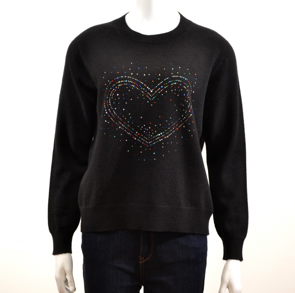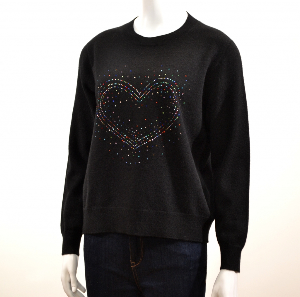 On craque volontiers pour ce joli modèle visuel affichant un motif "COEURS" réalisé en brillants de différents couleurs. Ce pull comporte une encolure ronde, des manches longues terminées par un poignet côtelé sur des emmanchures arrondies et une base droite sur une large bande côtelée vous assurant ainsi une parfaite tenue. Ce pull présente une forme confortable. Il est confectionné sur un support en pur cachemire.