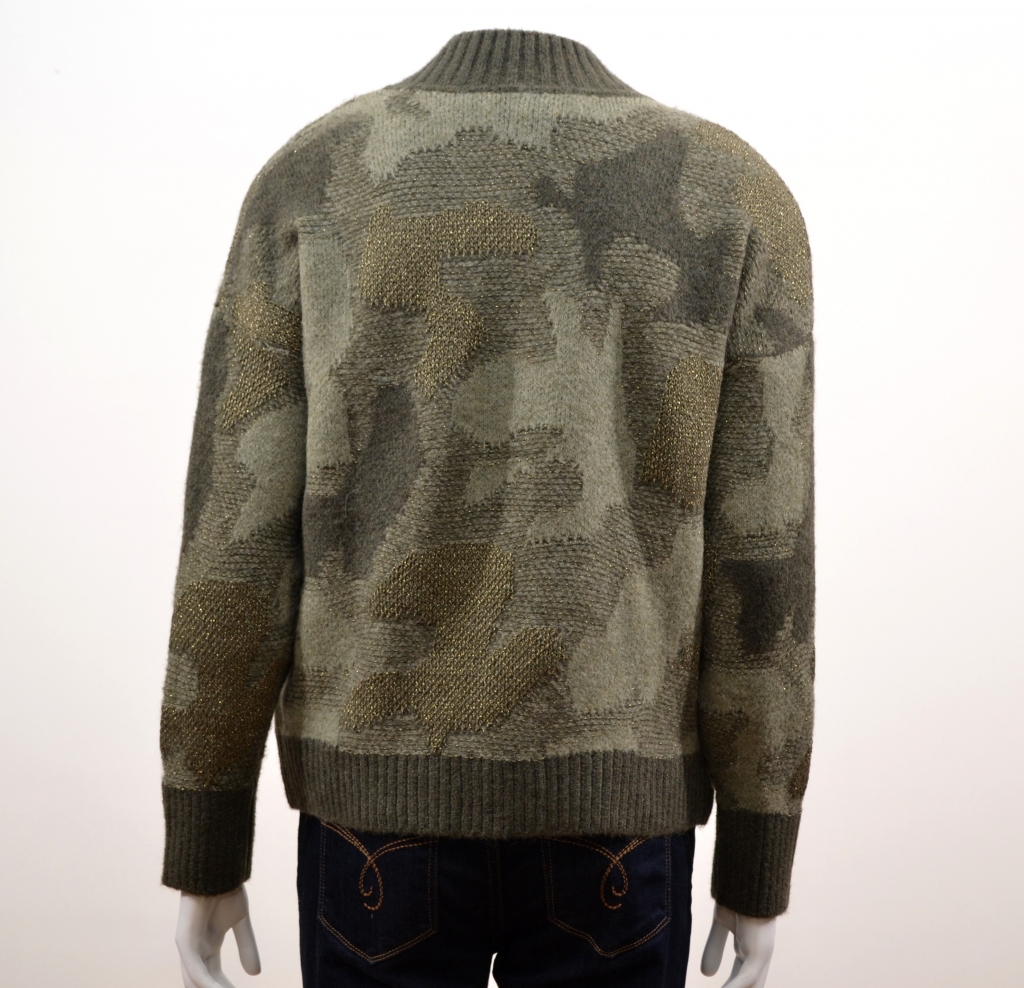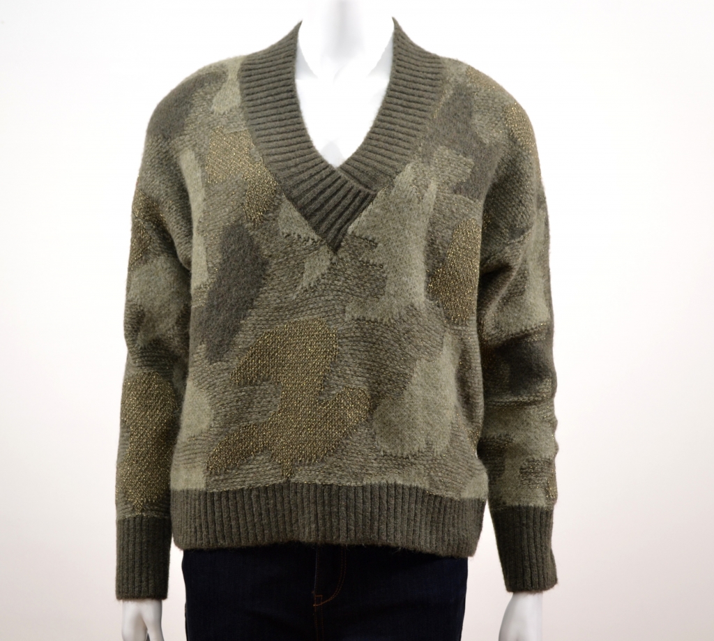 Un joli pull affichant différents jeux de maille et nuances de couleurs qui fera très crtaiement plus d'une envieuse. Ce pull comporte une très belle encolure en V prolongée par une large garniture côtelée, des manches longues sur des emmanchures droites et une finition côtelée à la base vous assurant une parfaite tenue. Ce pull présente une coupe loose. Il est confectionné sur une belle maille douce et confortable et affiche des motifs façon camouflage en all-over avec quelques pointes de lurex.