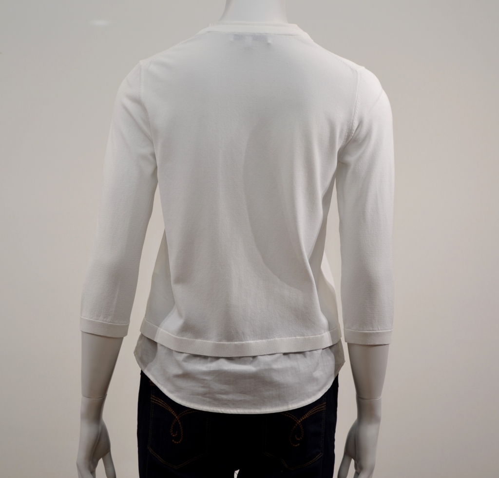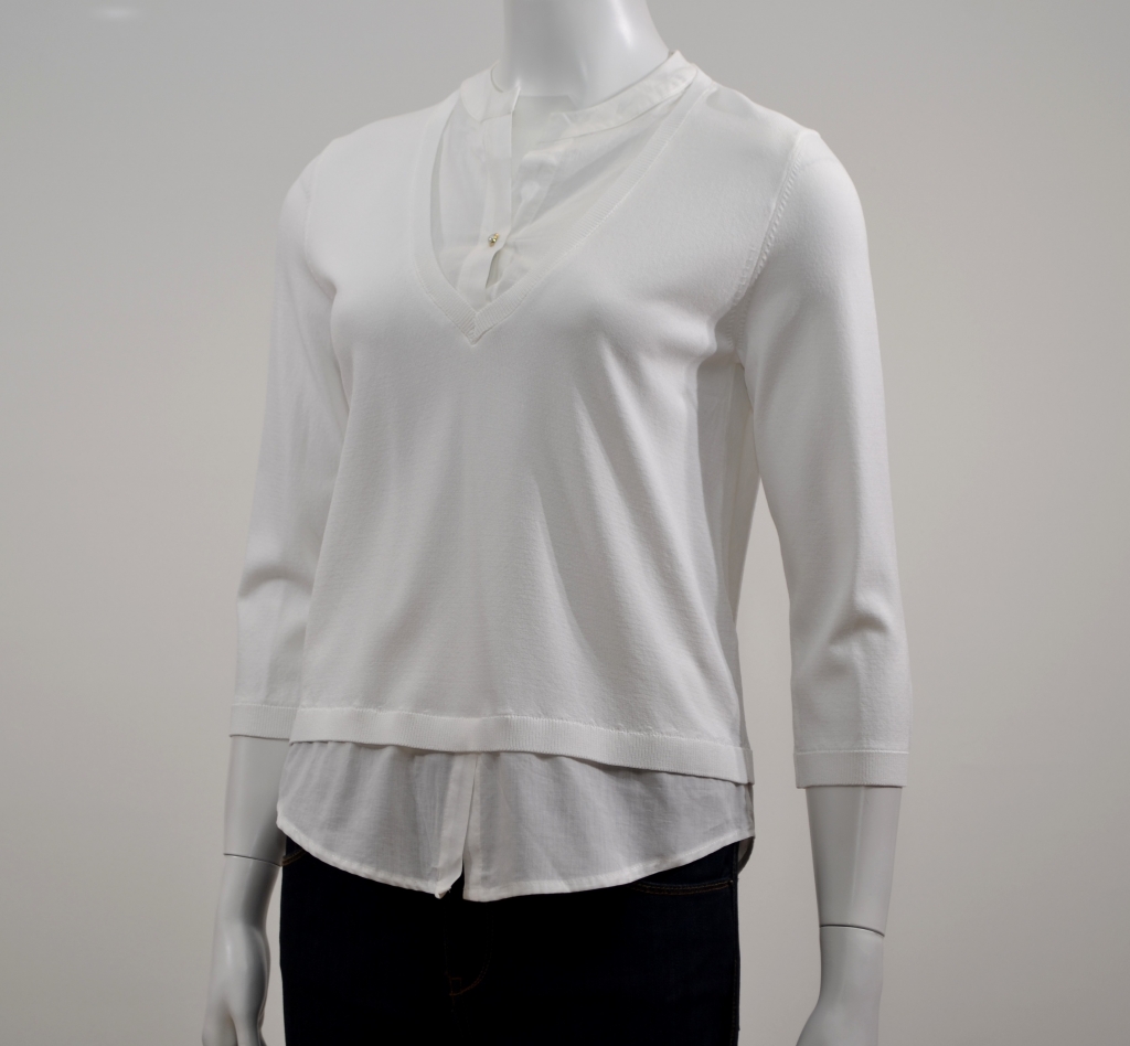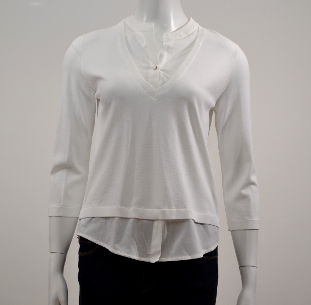Modèle original 2 en 1, très facile à associer aux différents pions de votre dressing. Ce pull comporte une belle encolure flatteuse en V, des manches trois quart fashion et une base droite terminées par un bord côte. Ce pull est complété par un empiècement façon chemise à l'encolure et à la base.