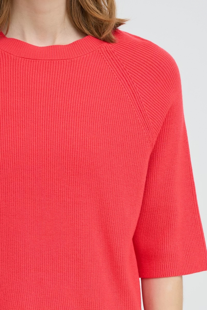 Pull en maille côtelée au tombé droit et légèrement ample, col rond, manches raglan longueur coude. Texture douce et silhouette épurée.