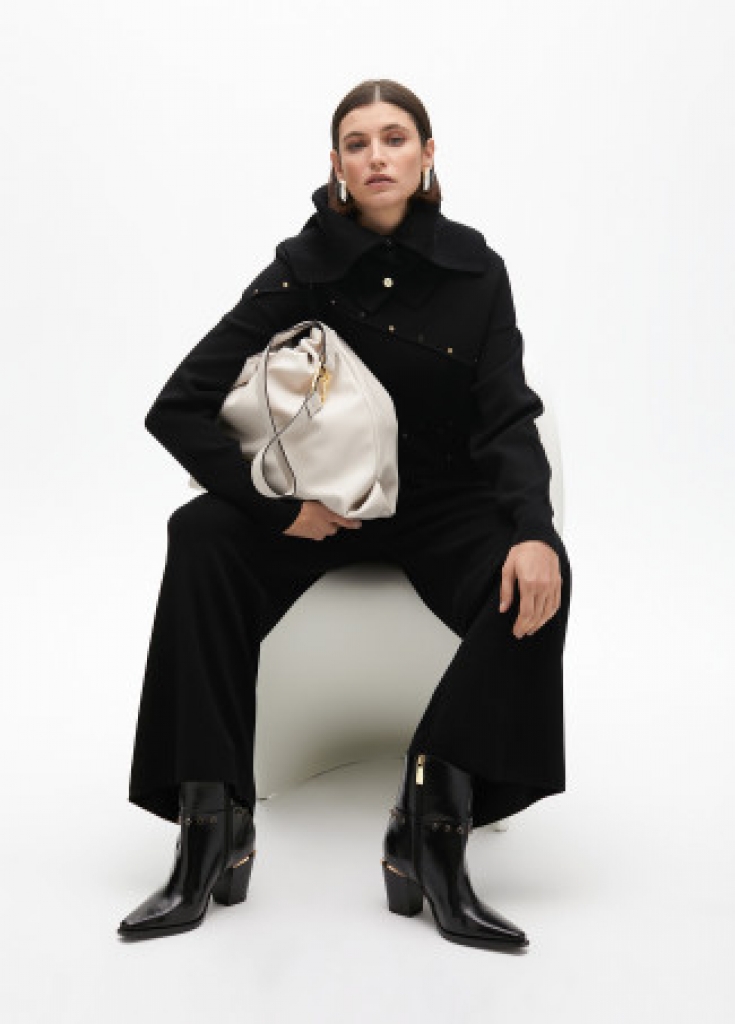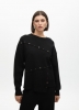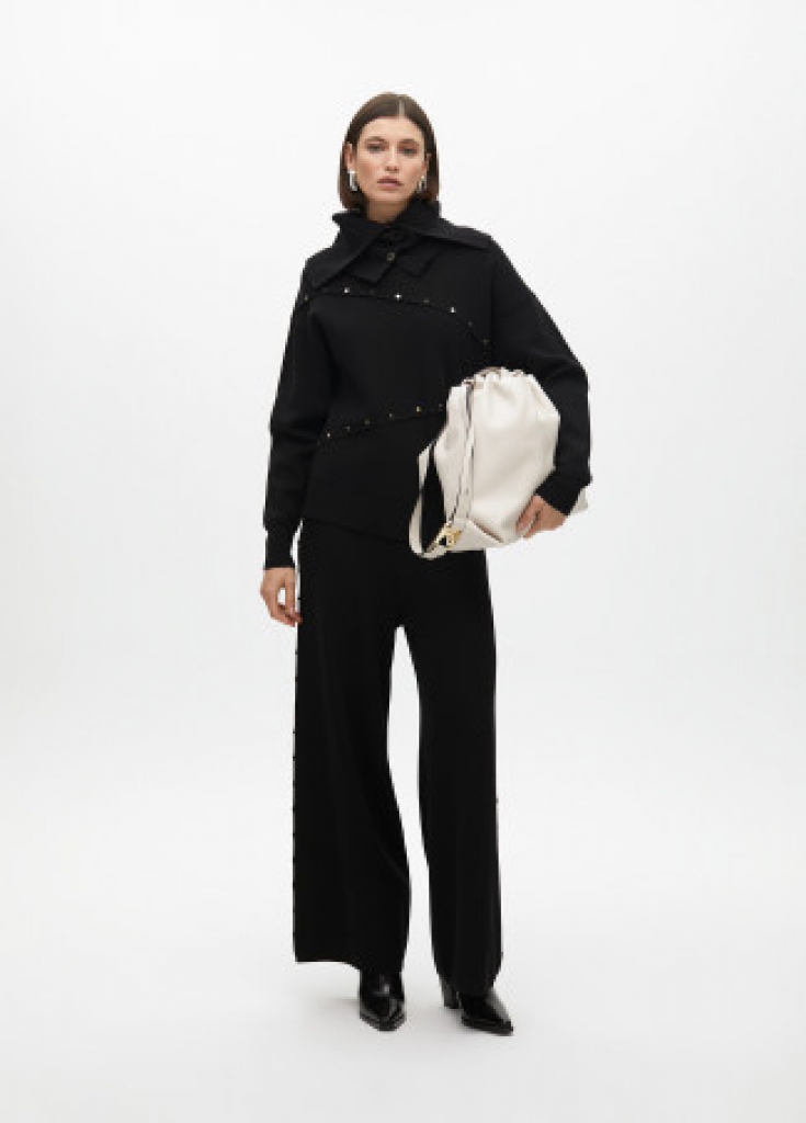 Pull noir déstructuré avec des détails clous dorés élégants. Confectionné en tissu doux, avec un design asymétrique et moderne. Idéal pour un style décontracté mais sophistiqué.