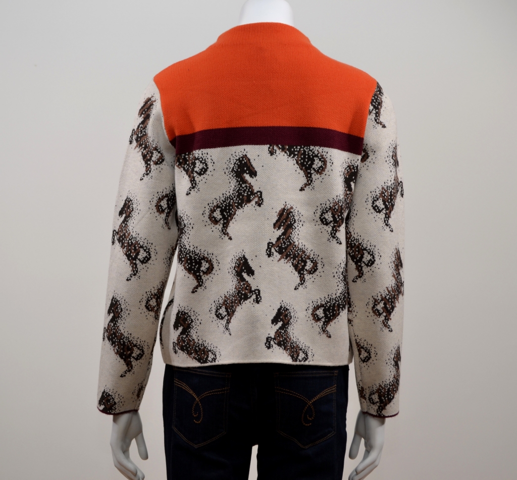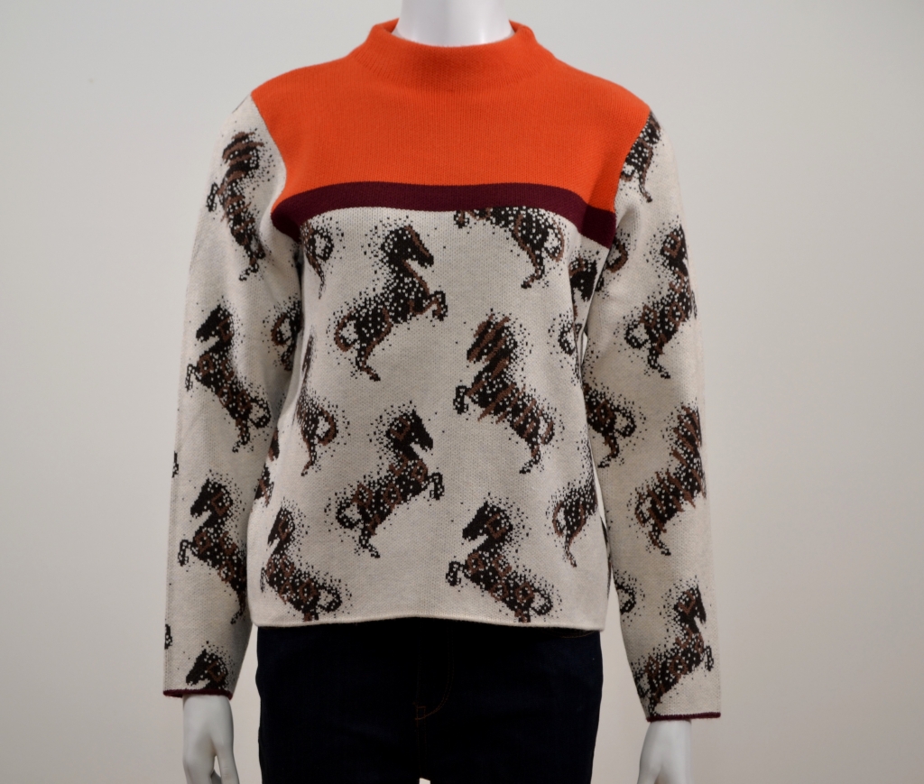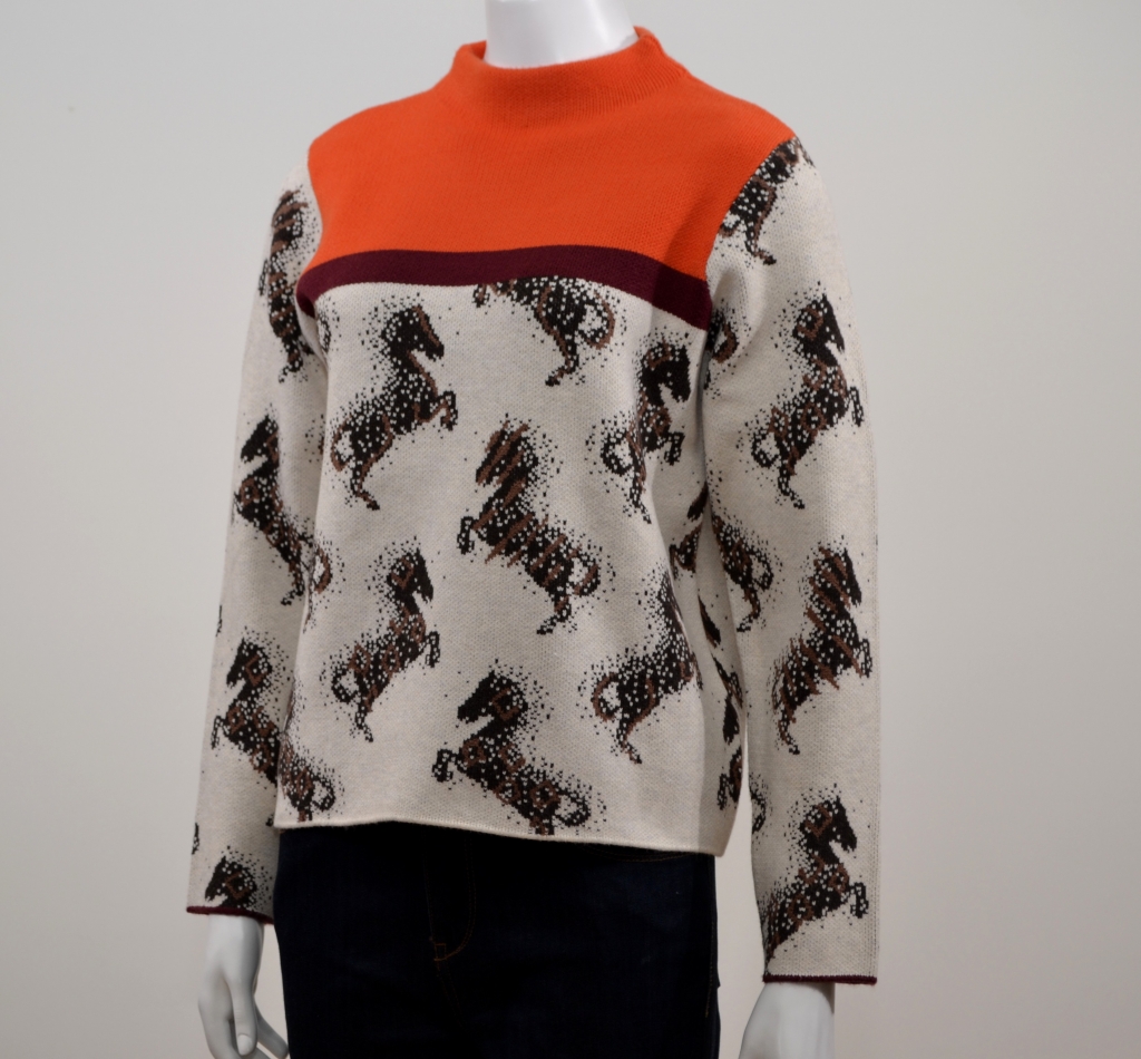 Mélange de viscose confortable pour ce pull tricoté en jacquard. Il comporte une encolure montante courte tournée vers l'intérieur, des manches longues sur des emmanchures arrondies, un empiècement uni orange devant et dos et un motif "cheval" tricoté en jacquard. Ce modèle présente une coupe décontractée sur une longueur normale.