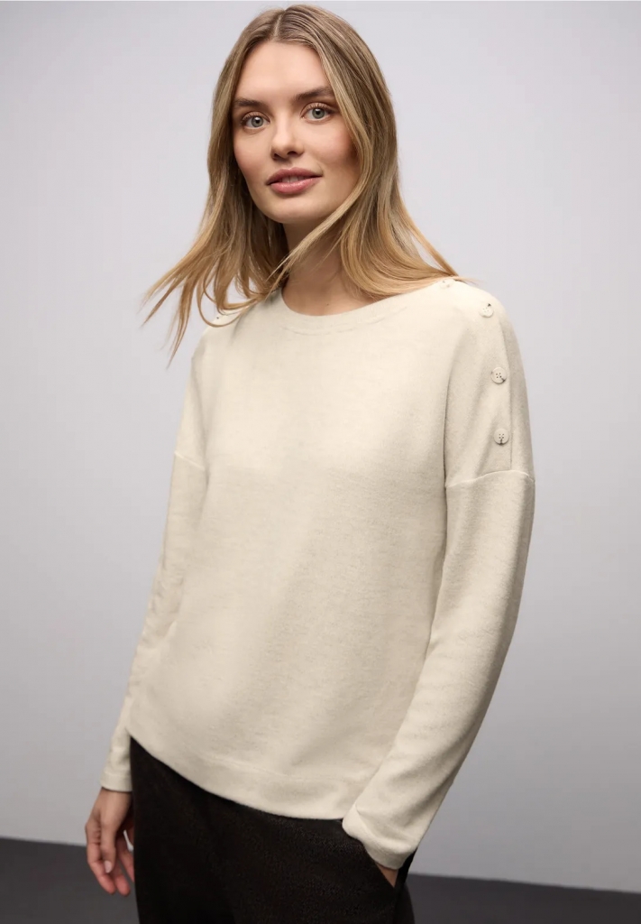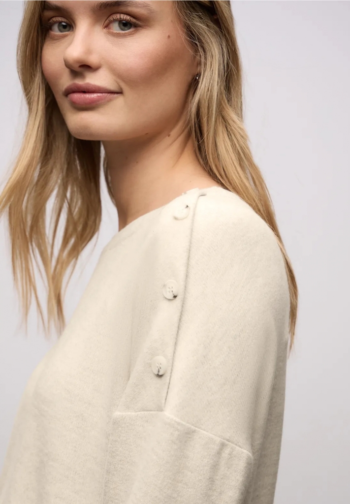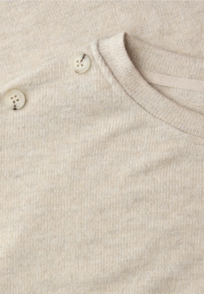 Ce pull séduit par son look mélangé féminin et ses détails de boutons discrets sur les épaules. L'encolure ronde et les fentes latérales à l'ourlet soulignent le design décontracté. La qualité douce est agréable à porter et s'adapte parfaitement à la vie quotidienne. Un favori polyvalent pour des tenues décontractées.