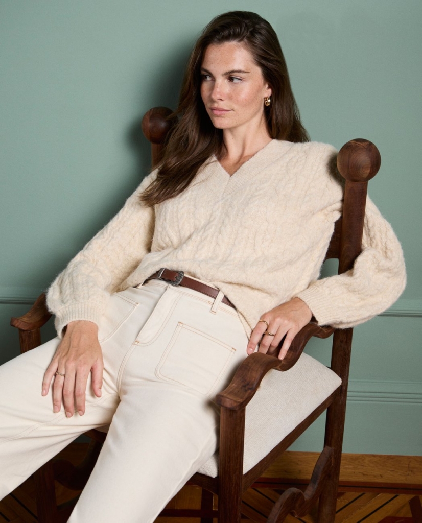 Pull en maille épaisse avec motif tressé de style aranais et encolure en V. Coupe ample et tissu recyclé avec une finition douce et structurée. Un vêtement chaud et polyvalent à l'esprit classique renouvelé. Idéal à combiner avec des chemises ou des tee-shirts.