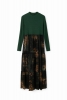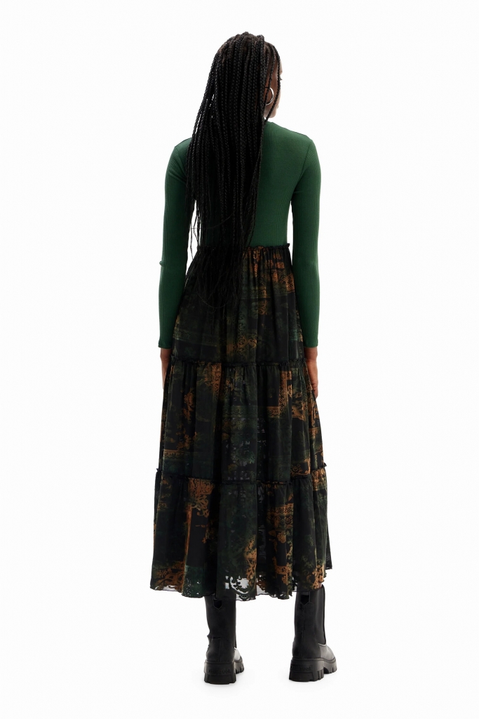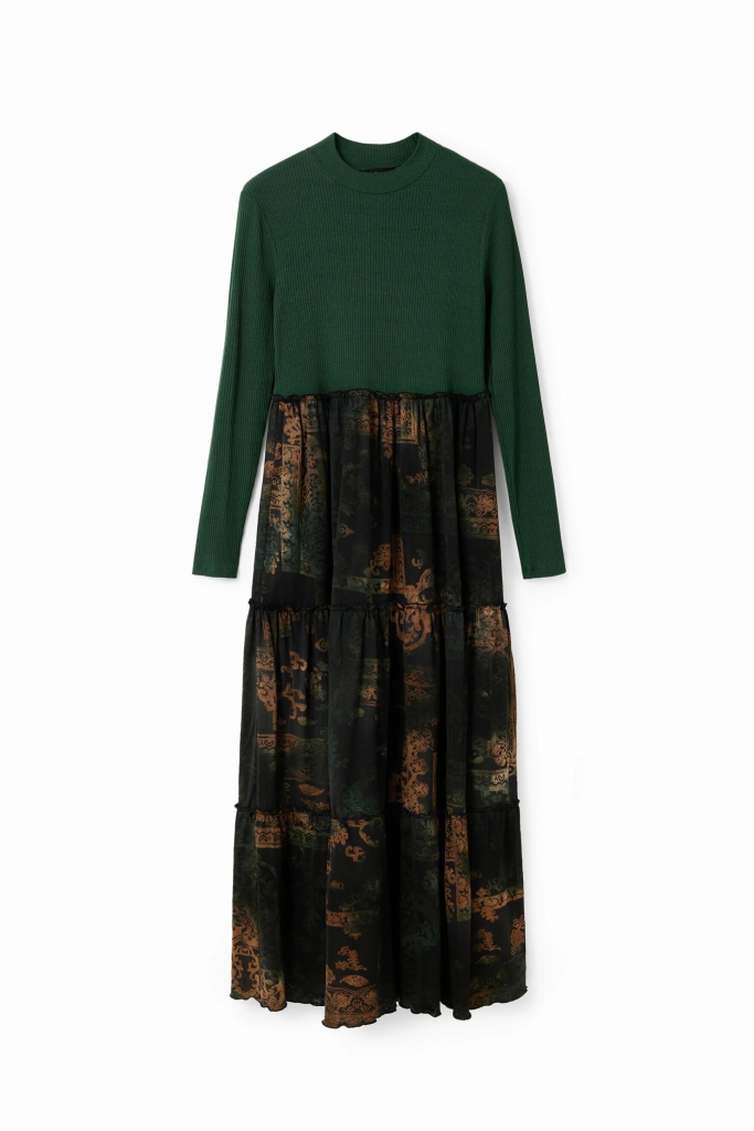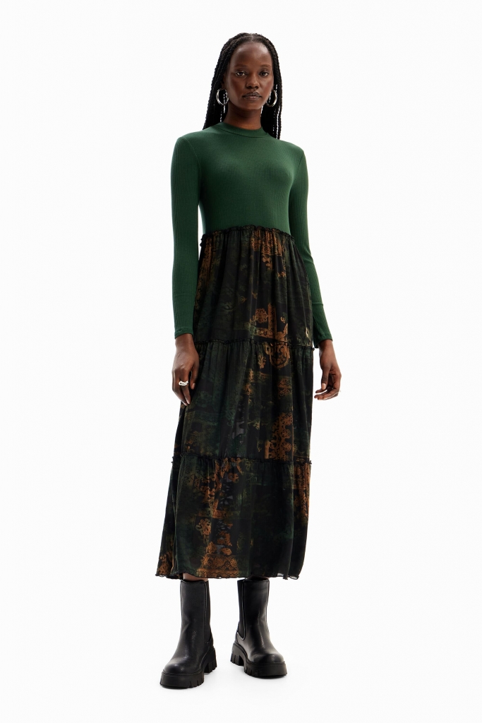 Robe midi effet deux pièces : un t-shirt ajusté en tissu côtelé à manches longues, et une jupe imprimée à la texture dévorée doublée d'un jupon court.