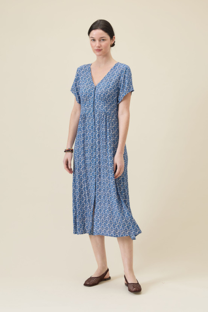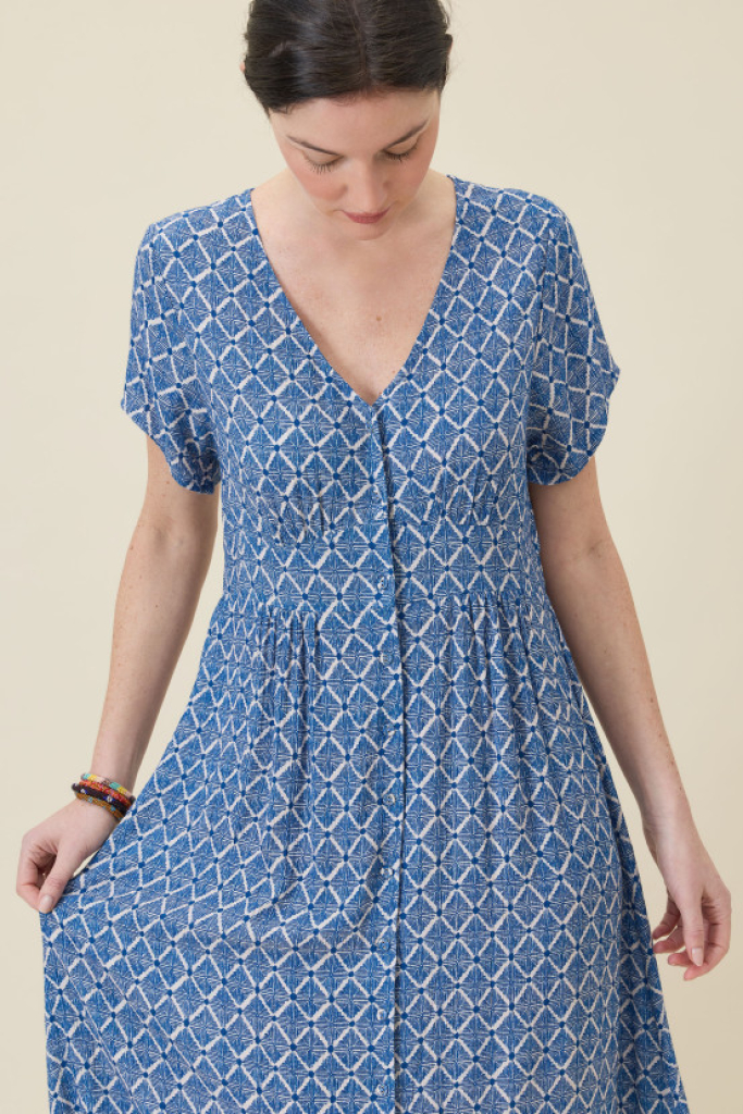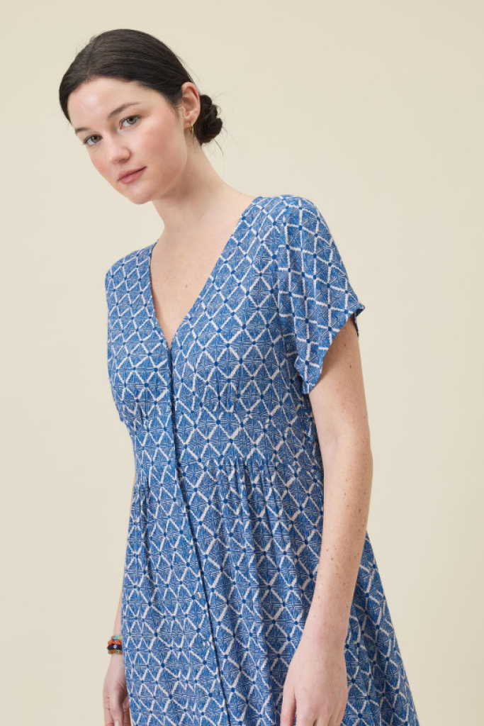 La robe JAYA sublime votre silhouette, légèrement appuyée à la taille et avec son volume généreux, elle est une pièce élégante et raffinée. Son imprimé et sa matière en crêpe de viscose en font une pièce unique.