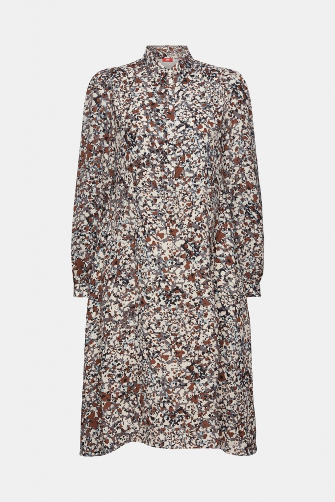 Entièrement confectionnée en fibres recyclées, cette robe-chemise à motif présente une base asymétrique et une coupe flatteuse.