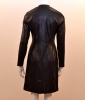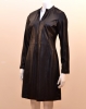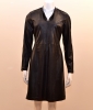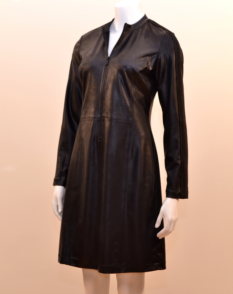 Le jersey cuir, une matière souple et confortable qui fait la spécificité des produits EVA KAYAN. Cette robe comporte une encolure ronde, des manches longues réhaussées par un large ruban tissé partant du col, une fermeture centrale à glisssière descendant jusqu'à la taille, différentes découpes avant et dos et une base droite avec fente arrière. Cette pièce présente une coupe droite sur une longueur en dessous du genou. Elle est confectionnée sur un support soumis à un traitement particulier lui conférant ainsi son aspect cuir.