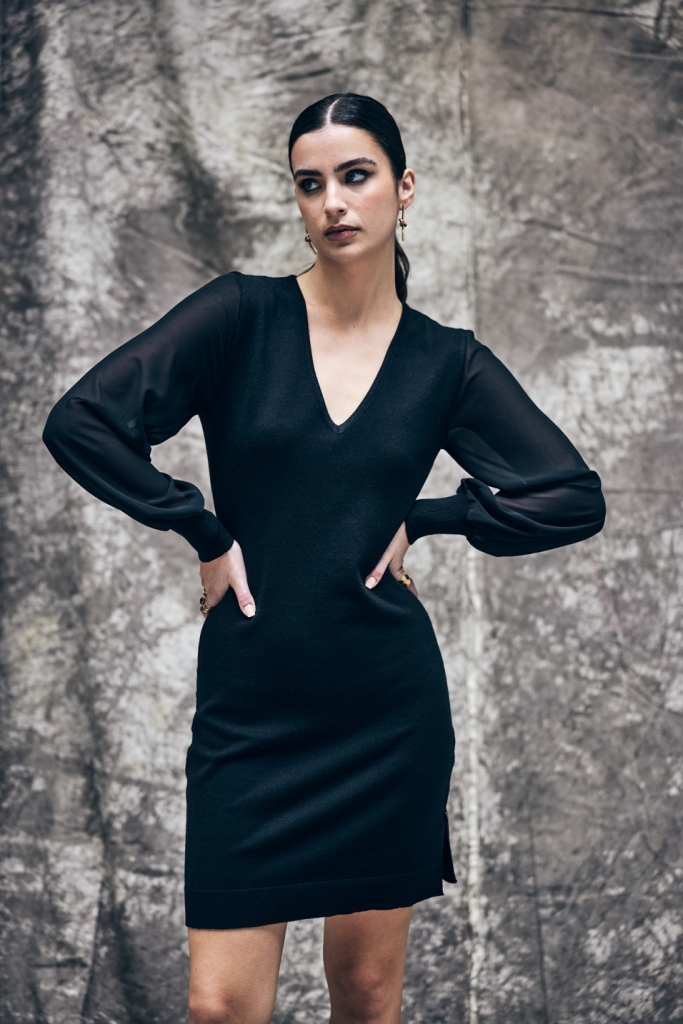 LES GAMBETTES SONT DE SORTIE : on ne prendrait pas le risque de se passer de la maille en automne. Ici en robe courte, elle ne manque pas d'originalité pour flatter vos gambettes en toutes circonstances : des manches ballons en voile transparent, un col V légèrement arrondi et une couleur noire qui est un peu la couleur de la saison chez FREEMAN.