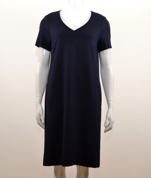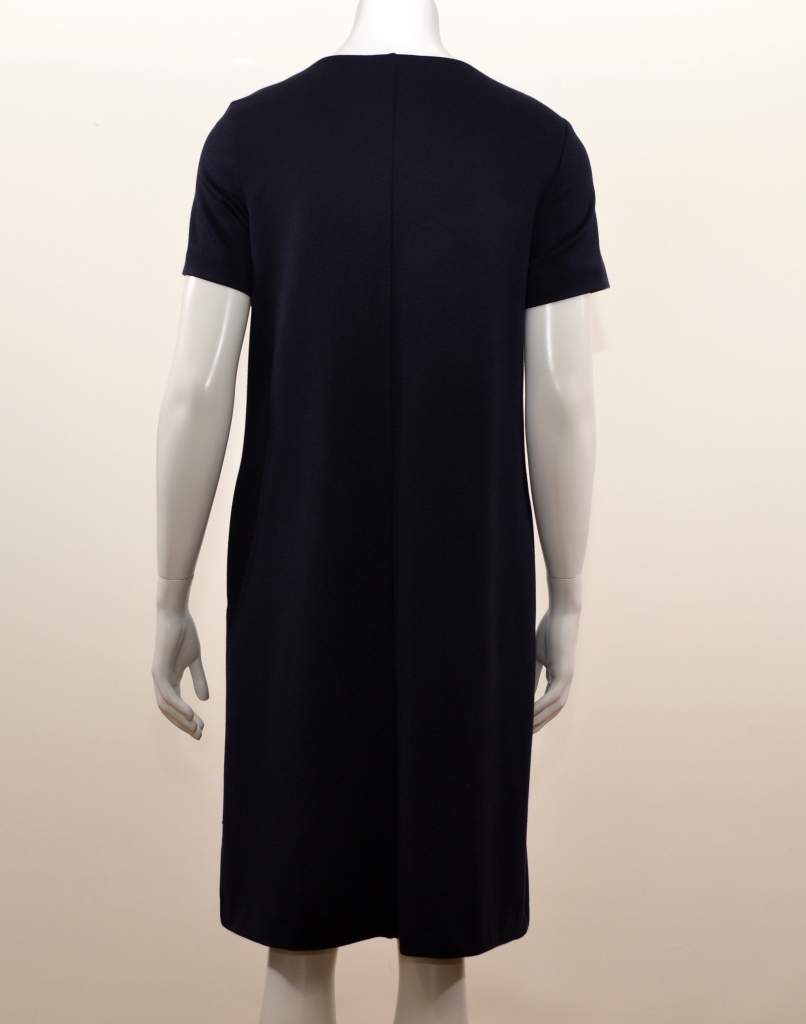 Très jolie robe en maille jersey pouvant convenir à toutes les morphologies et s'adaptant à toute les circonstances. Cette robe comporte une belle encolure flatteuse en V, des manches courtes sur des emmanchures arrondies, deux pinces buste et deux poches fendues couture. Cette robe présente une coupe droite sur une longueur en dessous du genou. Elle est confectionnée sur un support viscose/polyamide très agréable à porter.