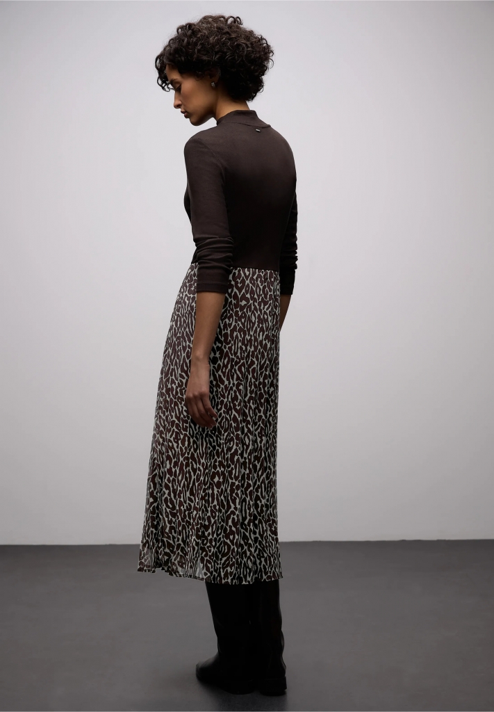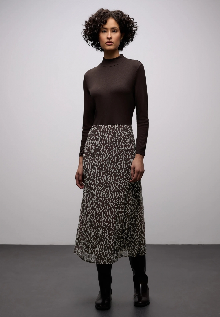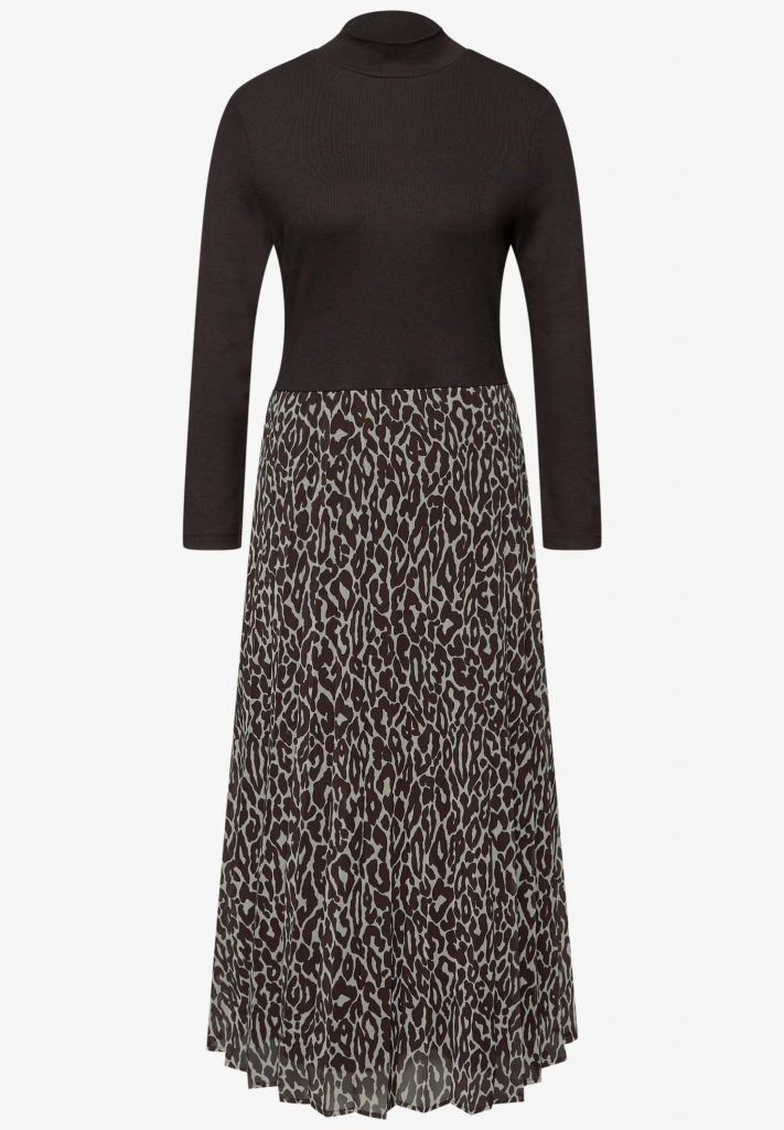 Cette robe combine un haut en jersey finement côtelé en couleur unie avec une jupe plissée féminine au motif léopard moderne et stylée. La robe est agréable à porter. La coupe confortable et l'imprimé animalier remarquable font de cette robe un accroche-regard dans votre garde-robe.