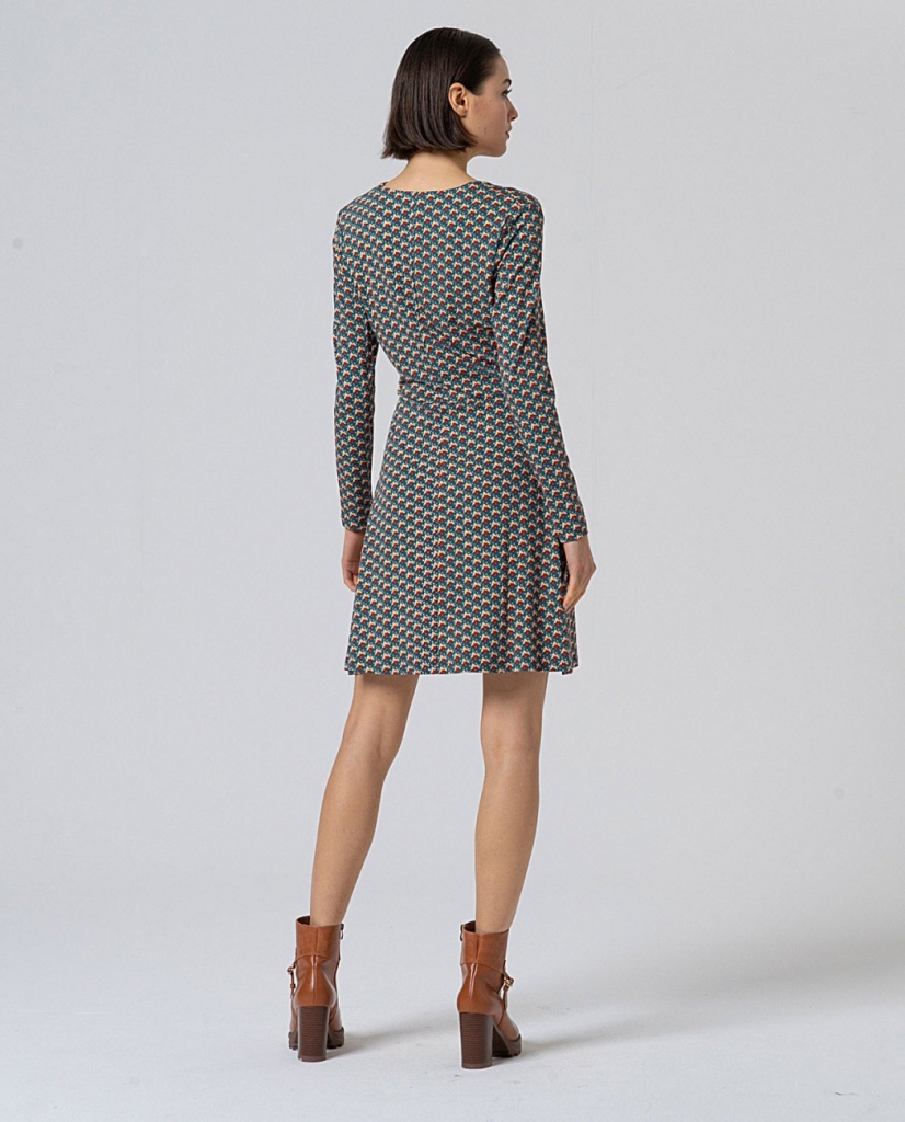 Robe courte à encolure croisée et taille froncée, dans un tissu doux et extensible qui s'adapte naturellement au corps. Son micro imprimé rétro et sa silhouette féminine en font un vêtement idéal pour toutes les occasions.