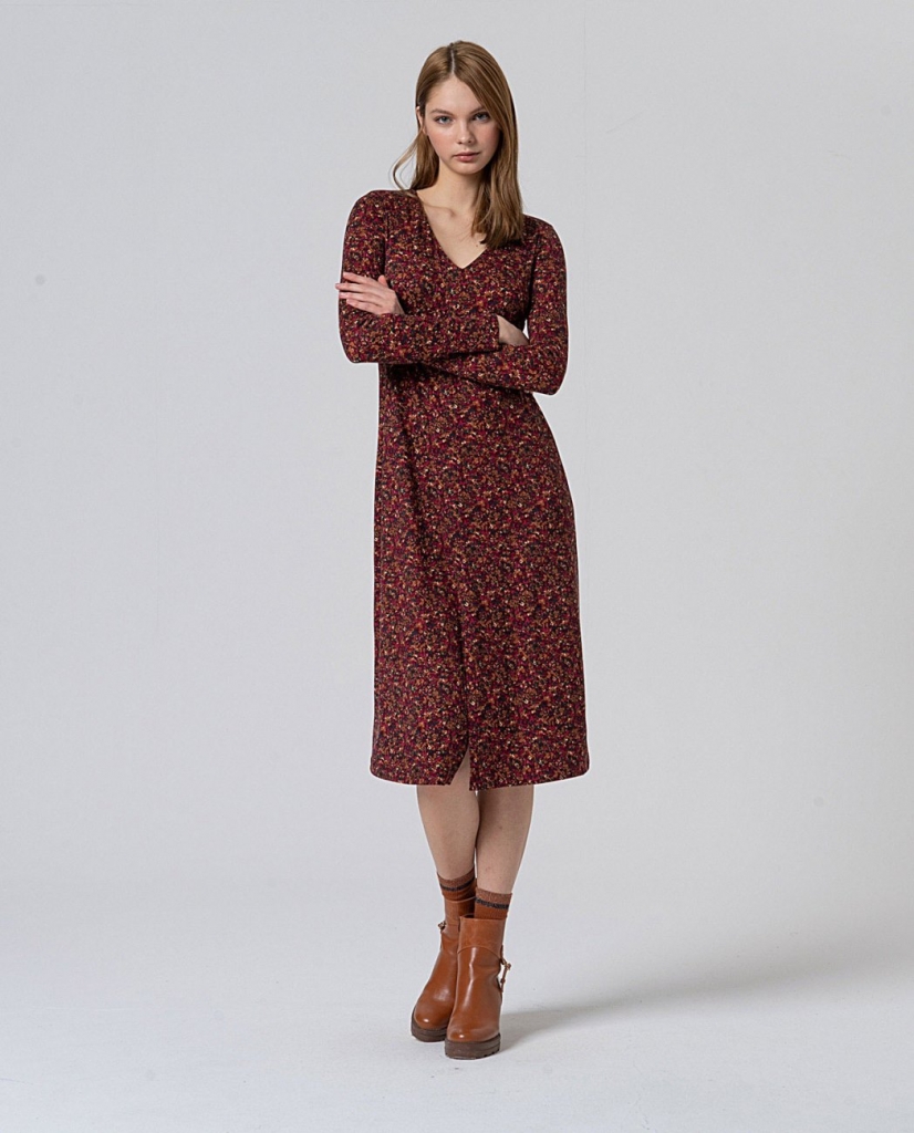 Robe à manches longues avec encolure en V et coupe évasée, ajustée à la taille. Fabriquée dans un tissu extensible en polyester recyclé, cette robe se distingue par son confort et son style féminin. Idéale à porter avec des bottines ou des baskets.