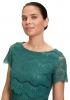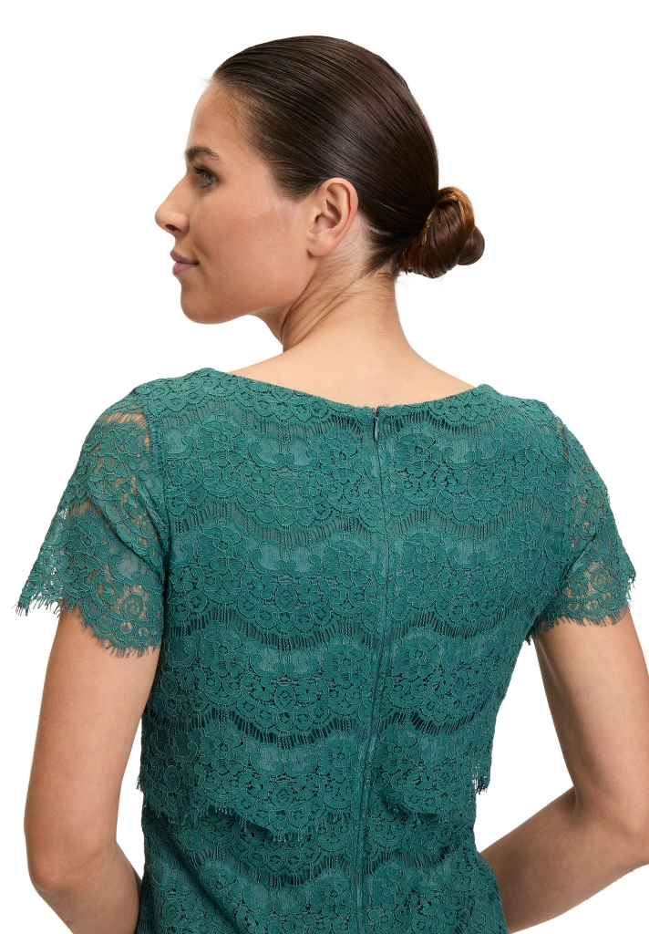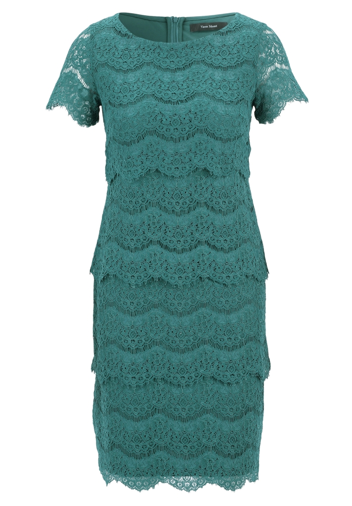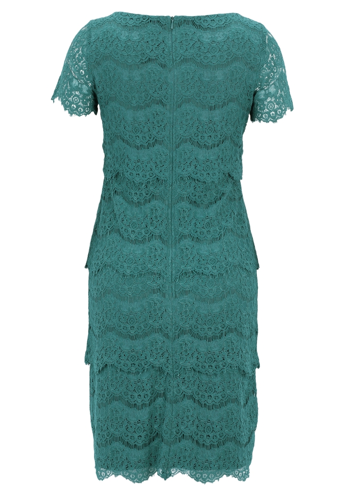Très belle robe de cocktail en dentelle avec laquelle vous ne passerez pas inaperçue. Cette robe comporte une encolure ronde, des manches courtes, deux pinces poitrine et une fermeture à glissière au centre du dos. Elle présente une coupe droite sur une longueur genou. Cette robe est confectionnée sur un support en dentelle, elle est dotée d'une superposition de volants permettant sans aucun doute d'allonger et donc de flatter la silhouette.