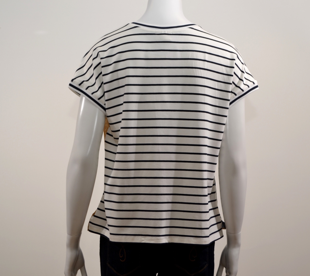 Rehaussez votre style au quotidien avec ce tee-shirt bleu marine et or affichant un imprimé abstrait et des rayures, conçu pour apporter une touche d'élégance moderne à vos tenues décontractées. Ce tee shirt comporte une encolure ronde soulignée par une bordure rayée en maille à côtes plates, des manches courtes et des fentes de côté. Ce modèle présente un volume droit. Il est confectionné sur un support fluide et léger offrant une sensation de douceur et de respirabilité, ainsi qu'un confort et une souplesse exceptionnels